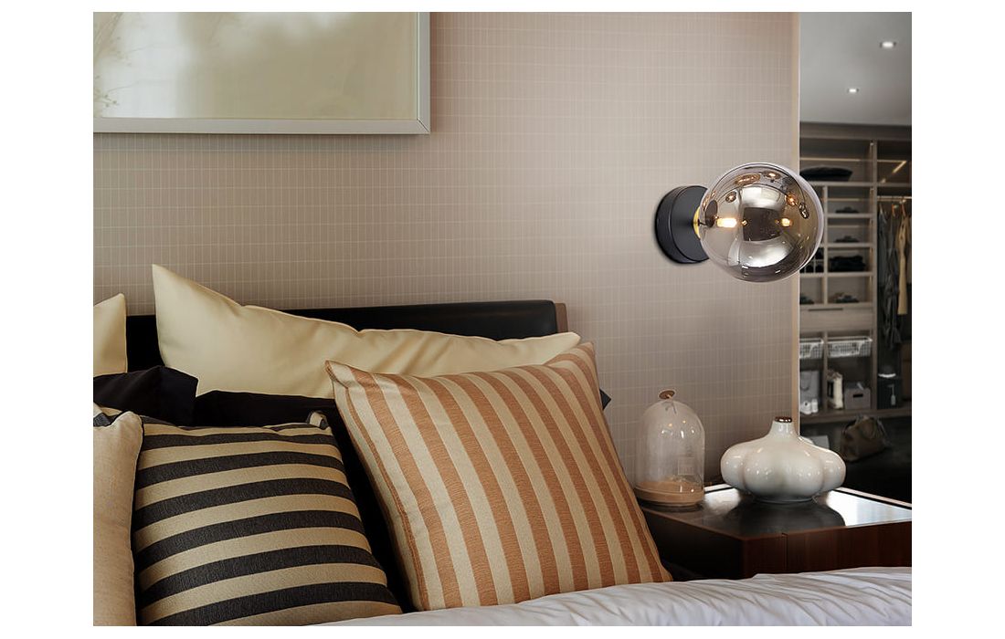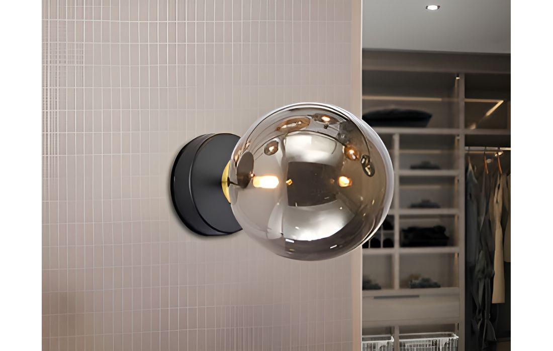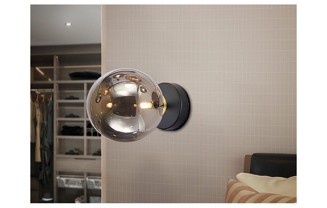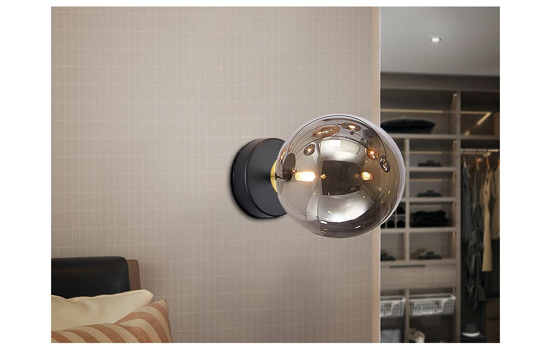 1-light wall lamp made of metal with a matte black finish, satin brass detail. 5 inch amber spherical glass lampshade. Bulb included 1 G9 LED 4W.