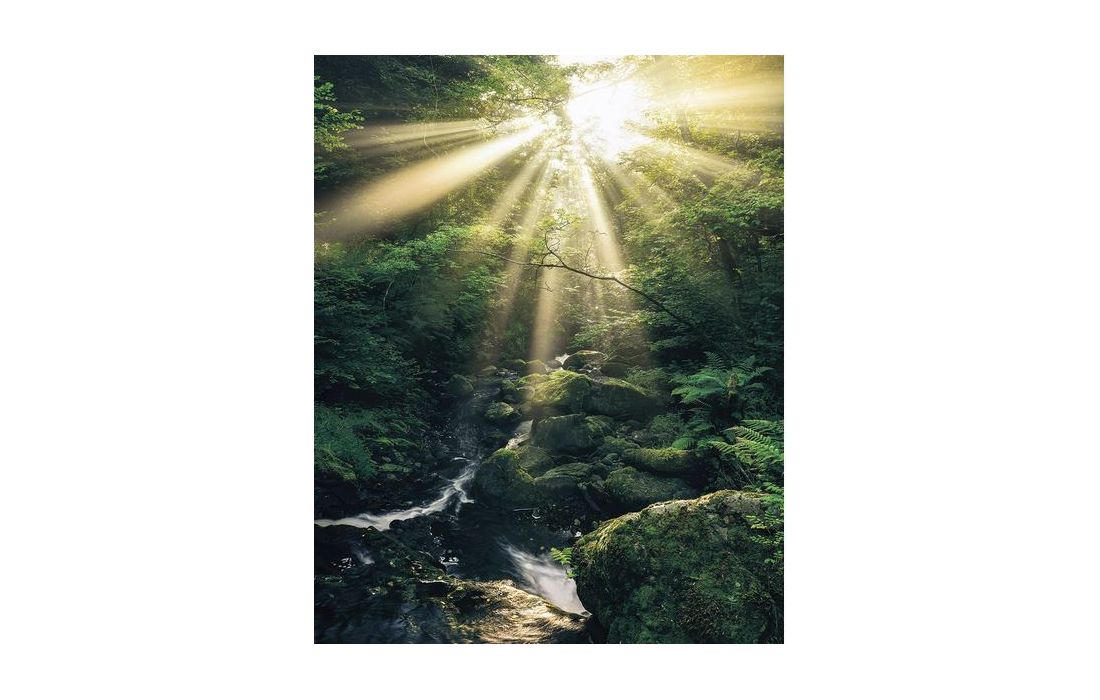 Golden sunrays are making their way through the green thicket.