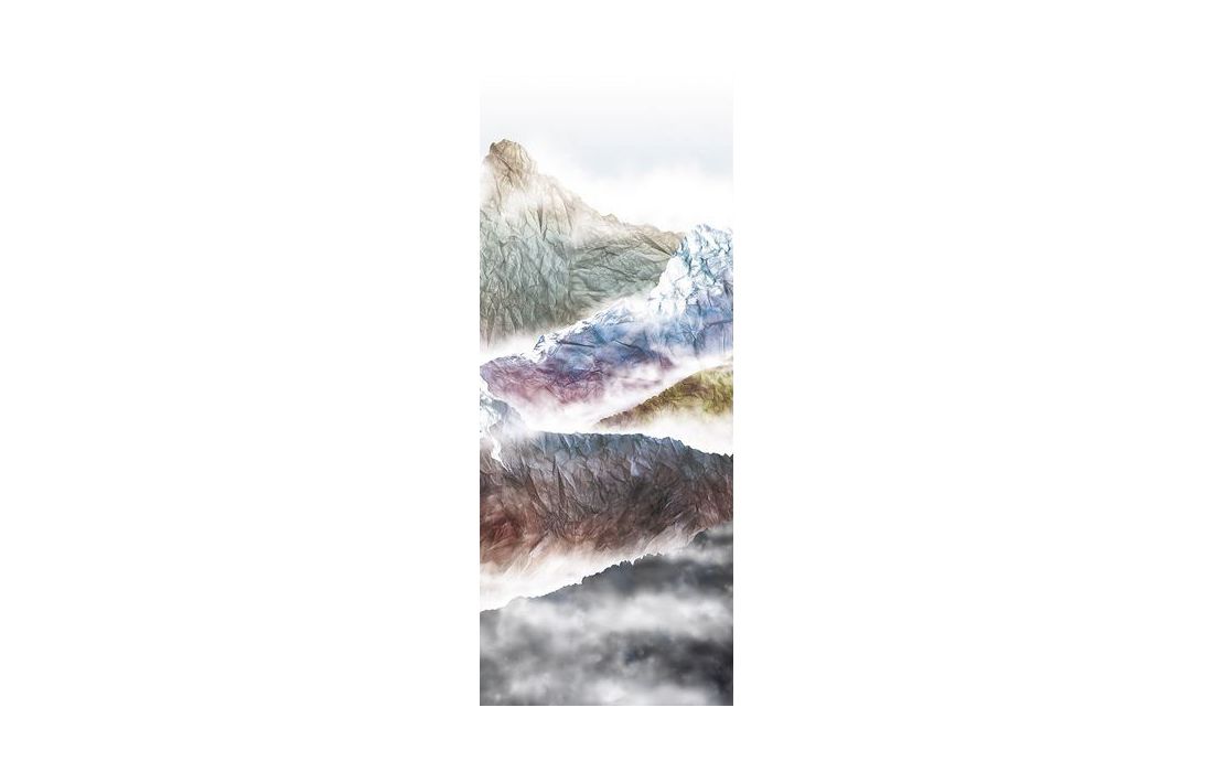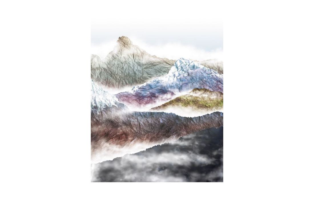 A paper collage rises up to form colourful mountain peaks.