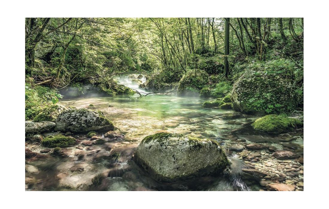 The clear mountain stream invites you to cool down in the cold water.