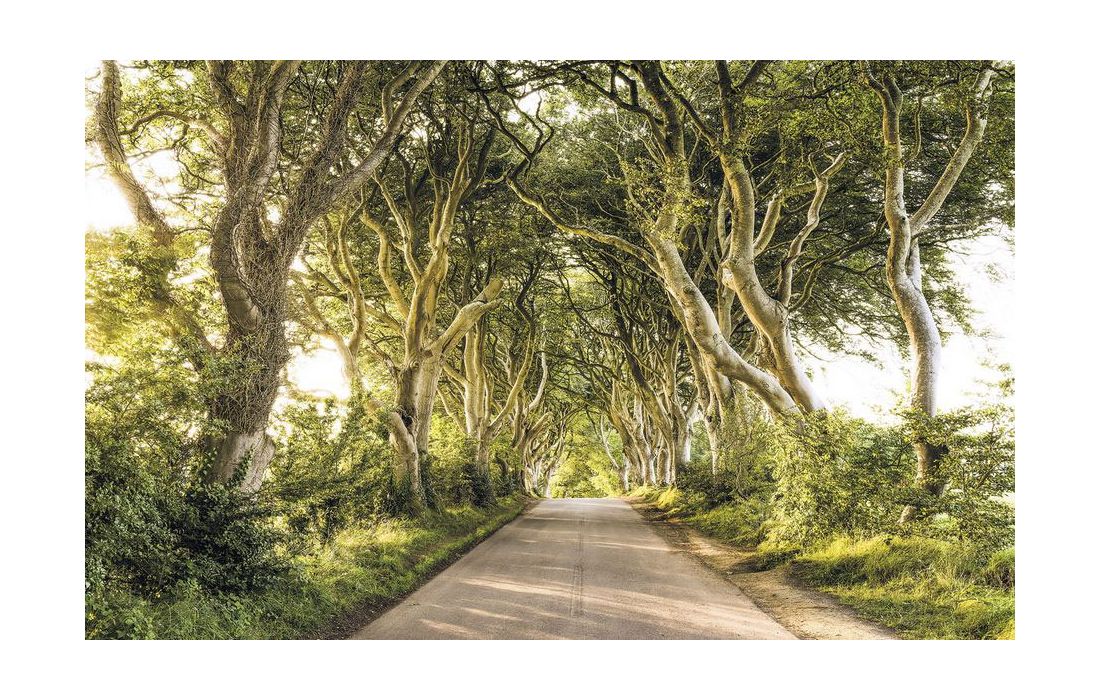 The golden light gently falls through the old trees of the Northern Irish Avenue.