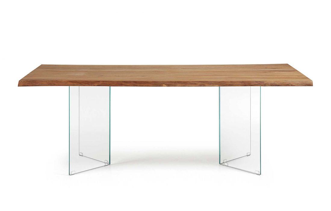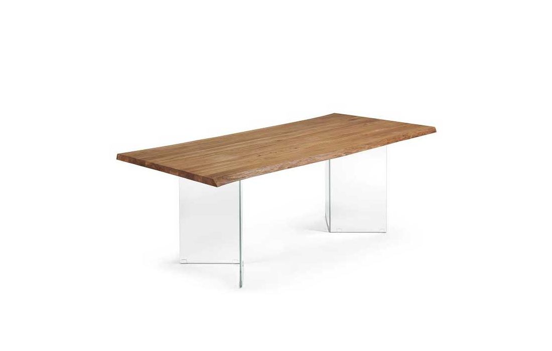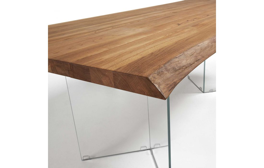 Table topped in oak solid wood with feet in tempered glass