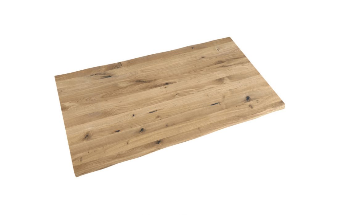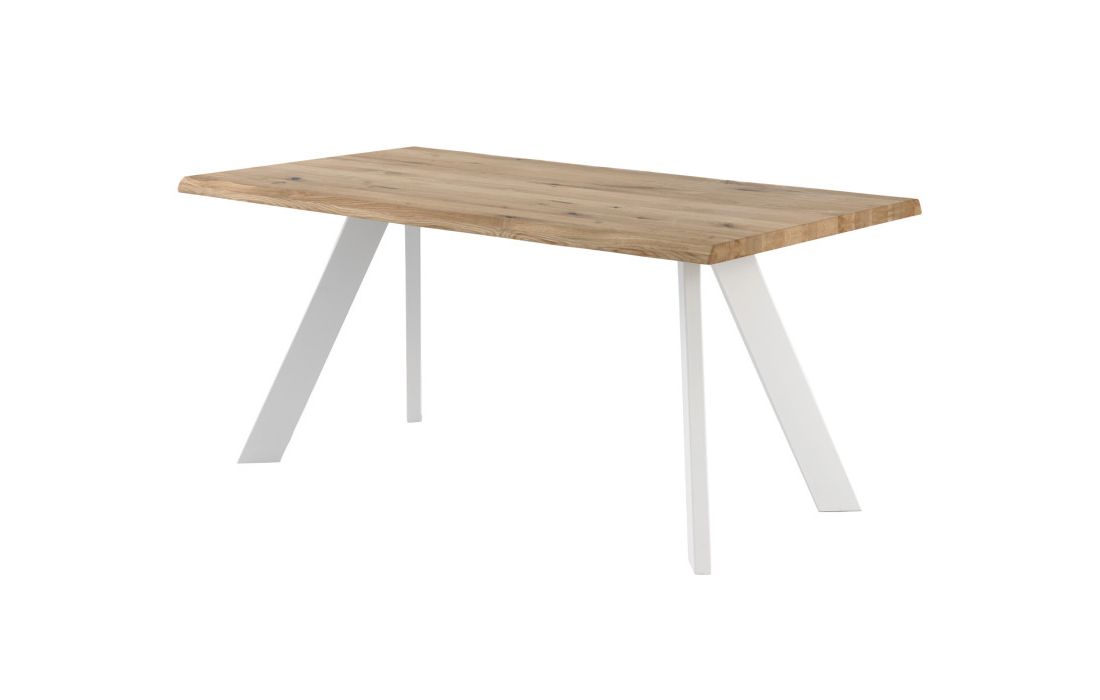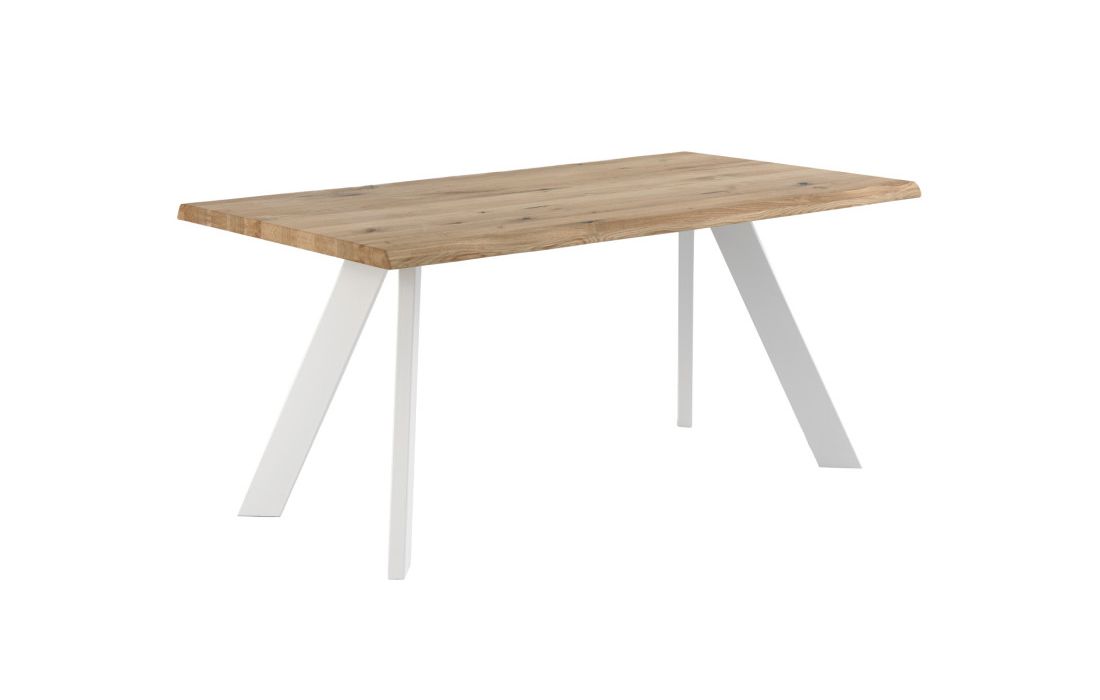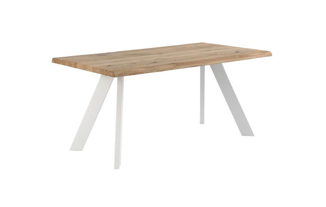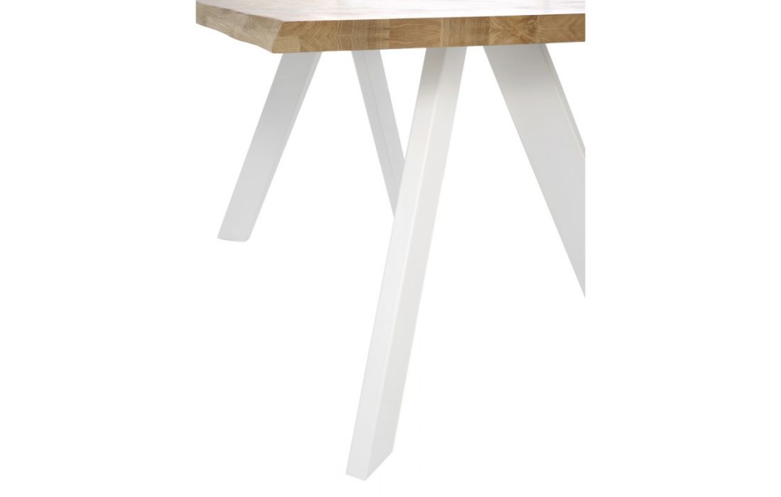 Rectangular dining table with white metal feet and fixed top in solid oak