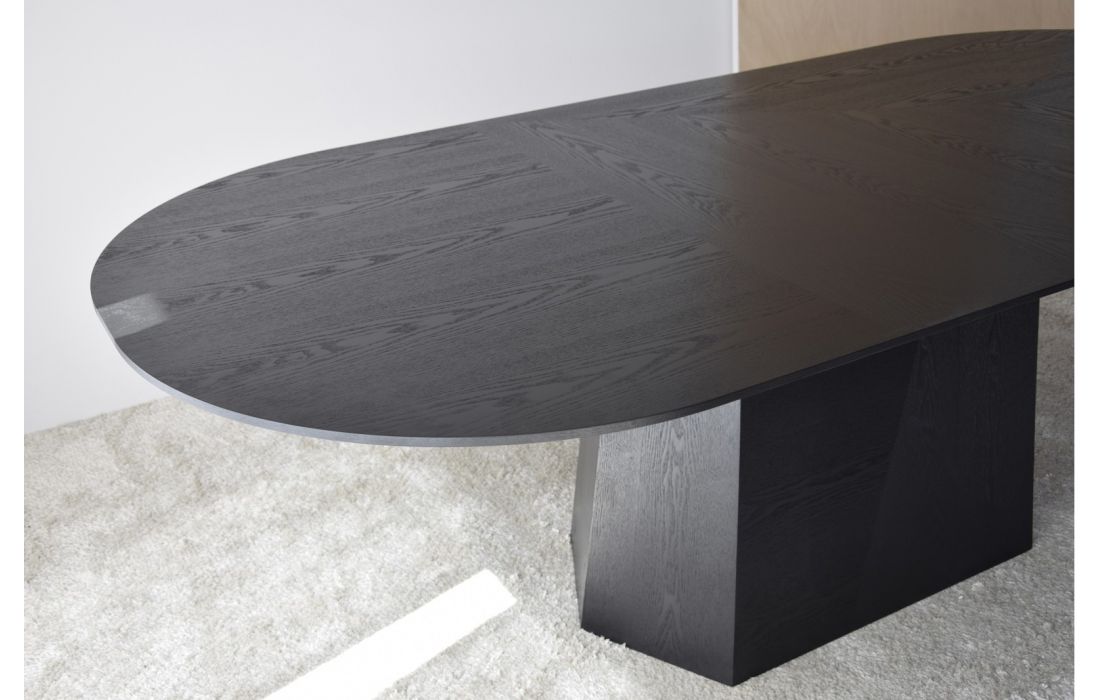 Dining table in mdf veneered in ash with matt black finish. The design of this table plays with the grains of the wood placed in different directions both on the surface of the top and on the base.Recipient :
