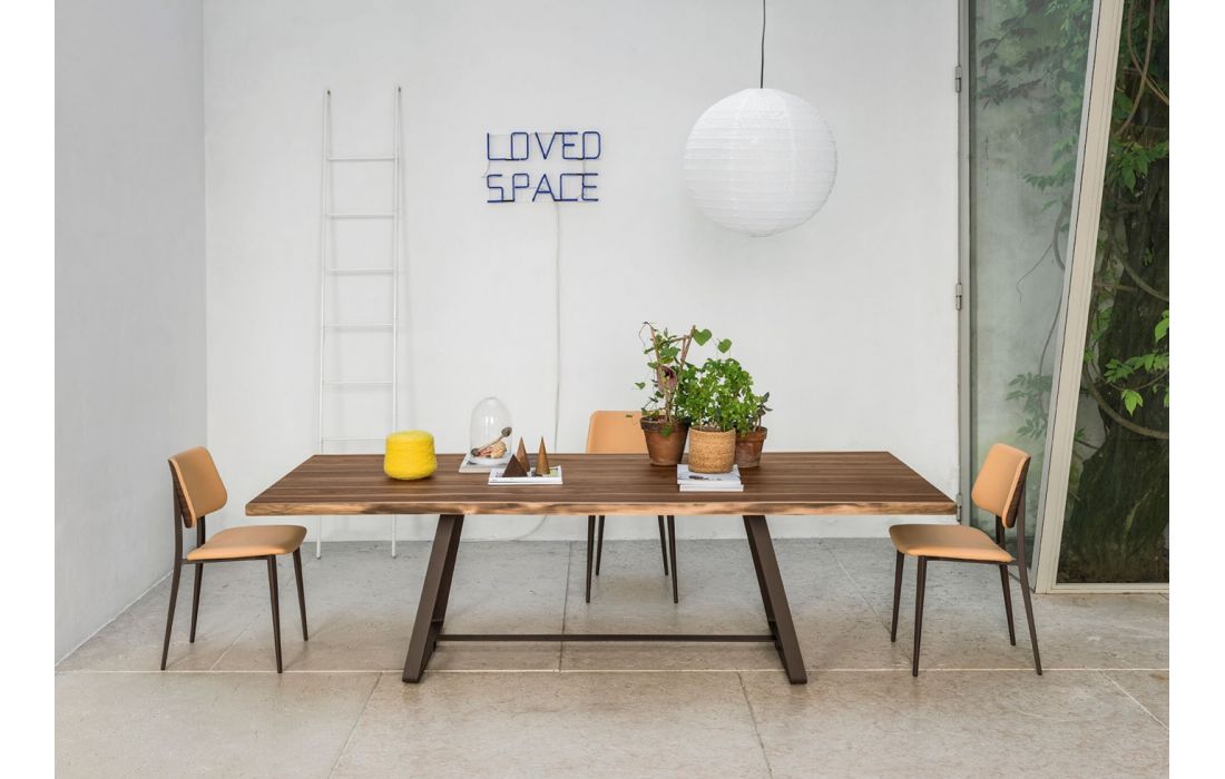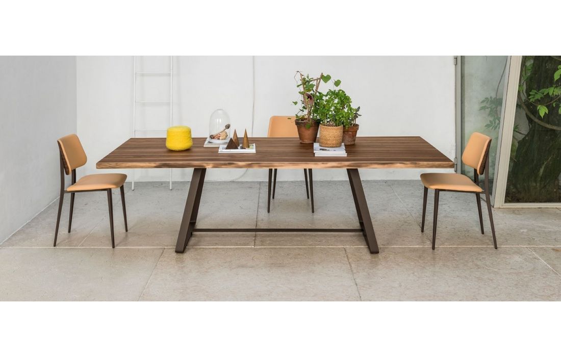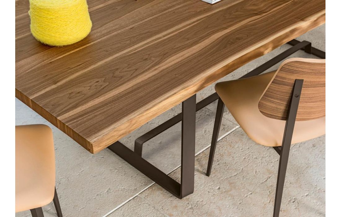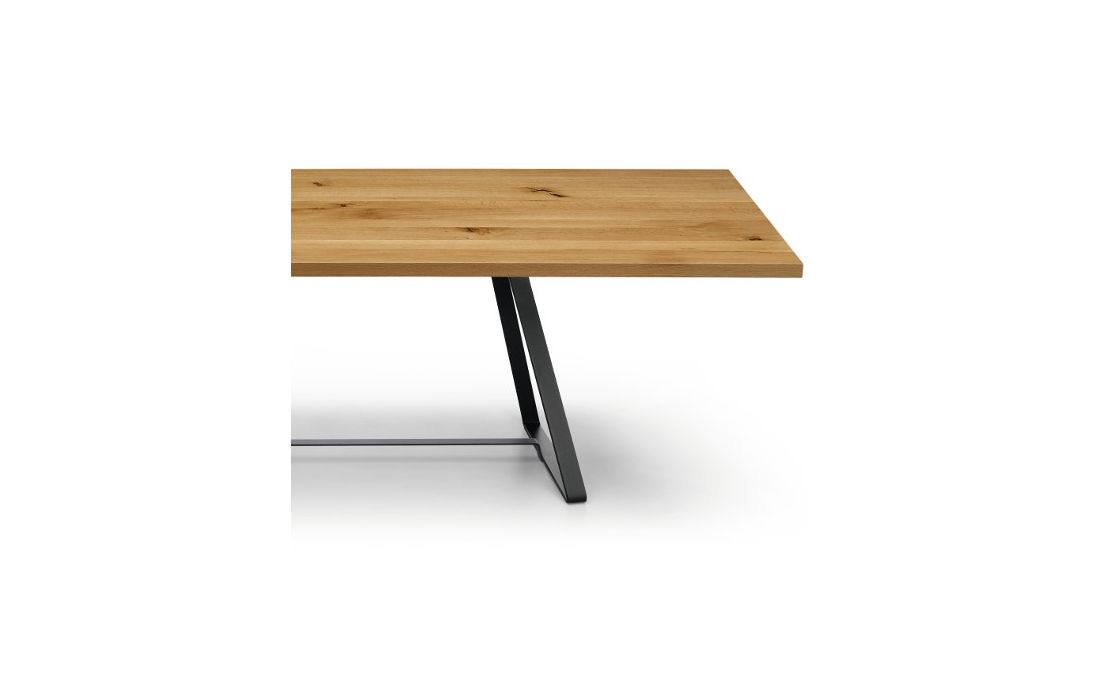 Dining table with sled base in lacquered metal. Top in solid wood or ceramic.