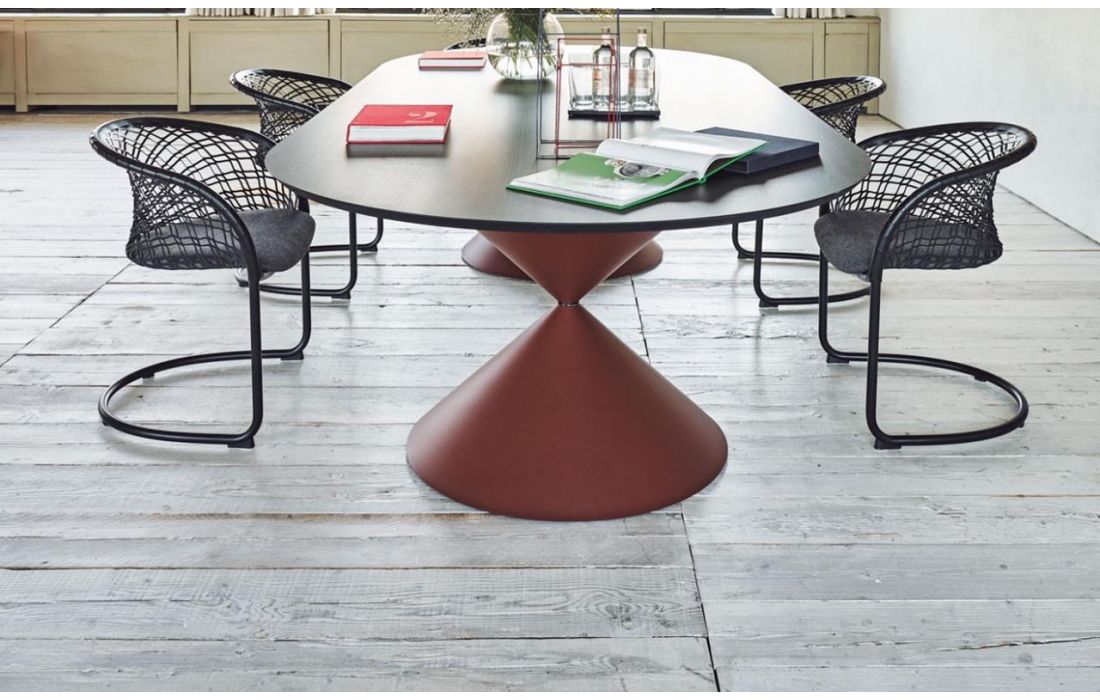 Fixed dining table with double base in solid metal or wood, with barrel-shaped top in veneered wood or ceramic