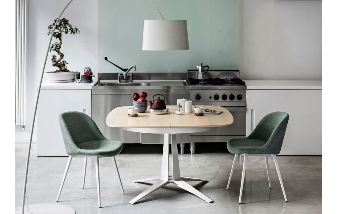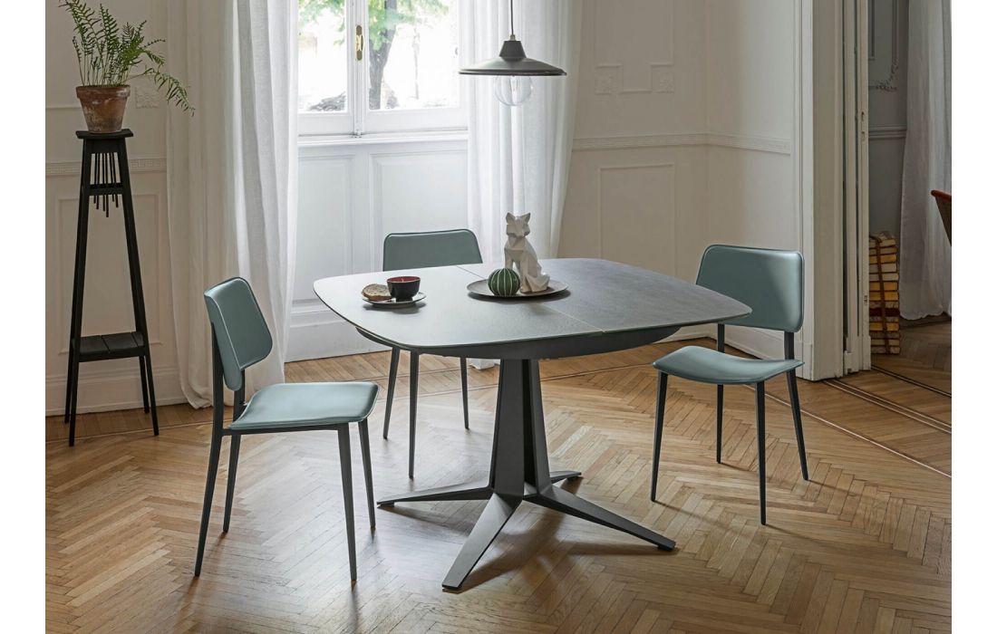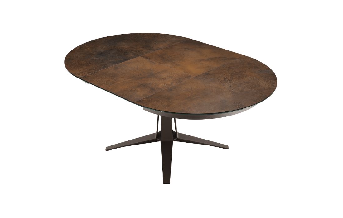 Extendable dining table with metal star base. Barrel-shaped or round top in ceramic or wood.