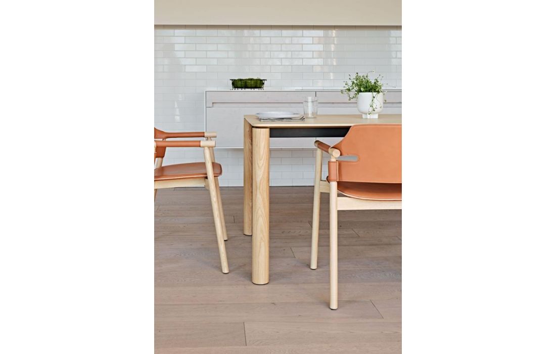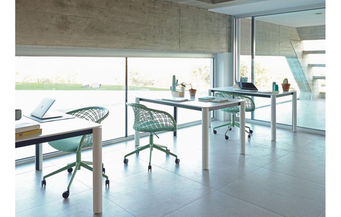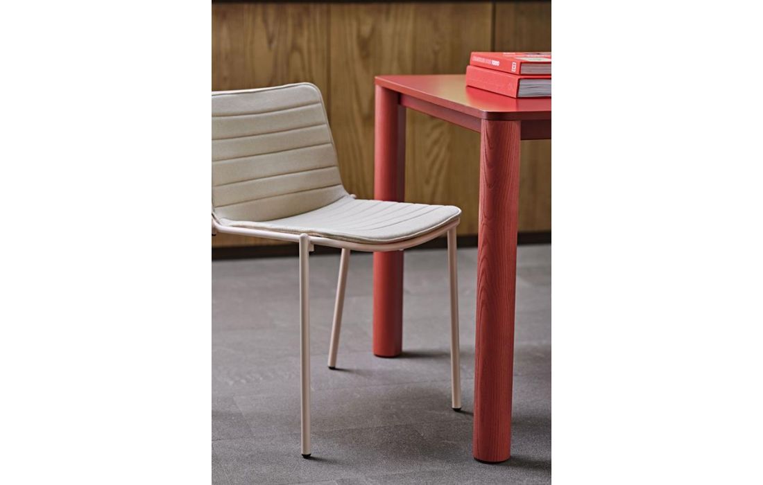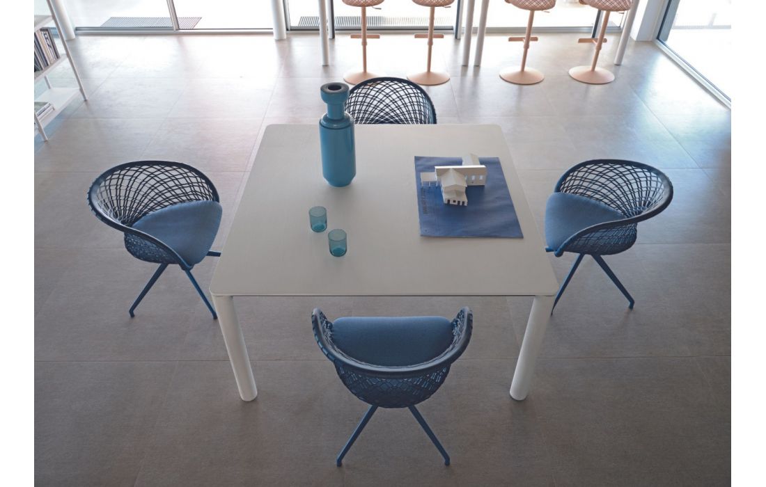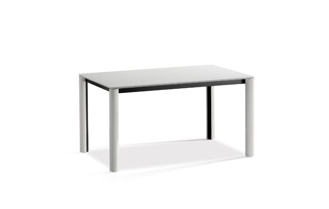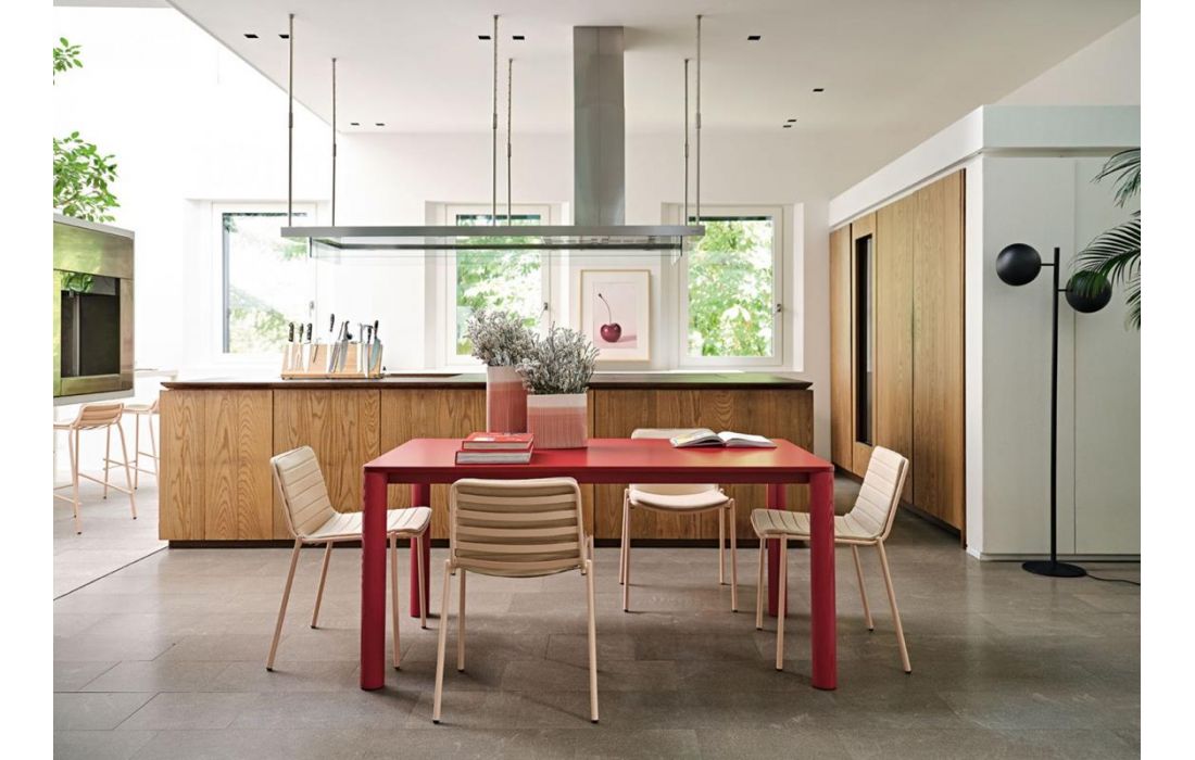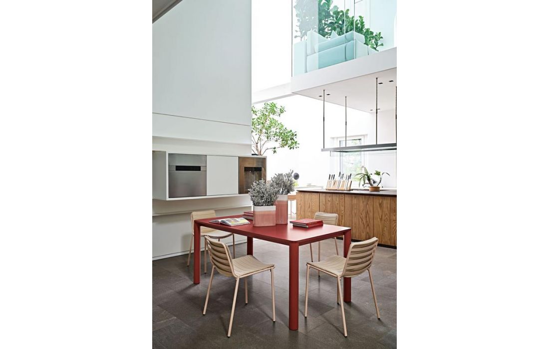 Fixed dining table with four legs in stained ash wood, with a lacquered metal core and metal structure. Top in veneered wood or laminato.