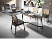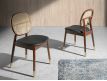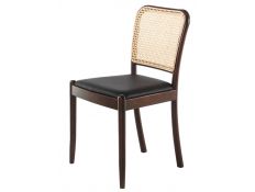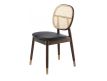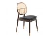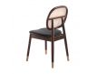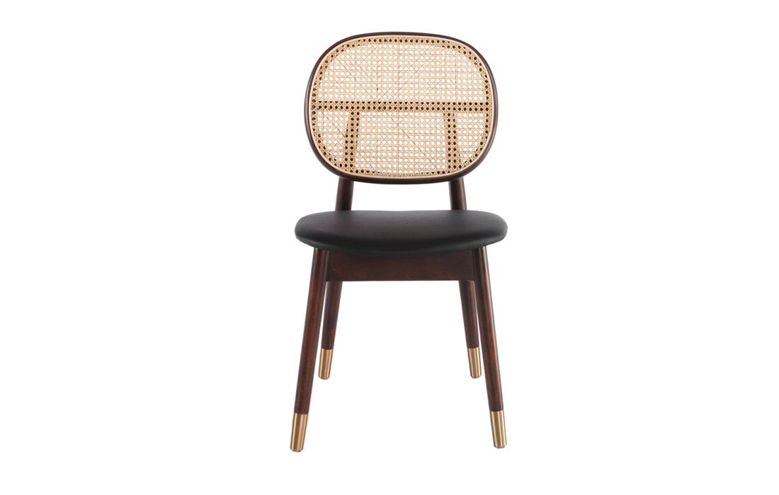 Dining chair in solid ash wood painted in walnut color with seat upholstered in synthetic leather and straw backrest with gold metal leg endsRecipient :