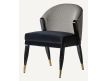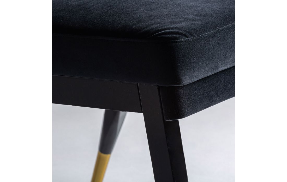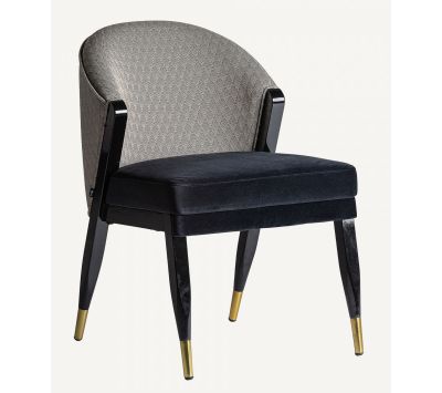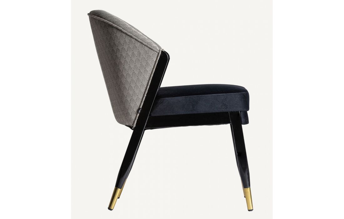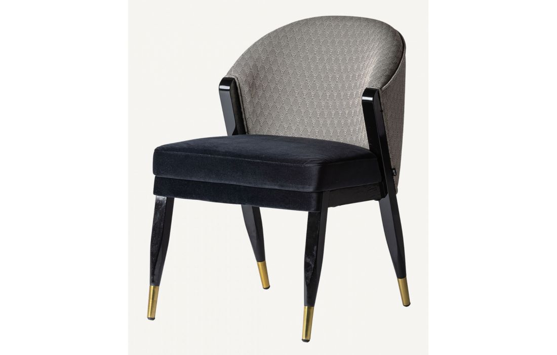 Wooden chair with golden metal detail on the feet and upholstered in velvet fabric on the green seat and patterned back geometric shapes