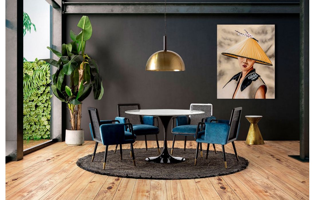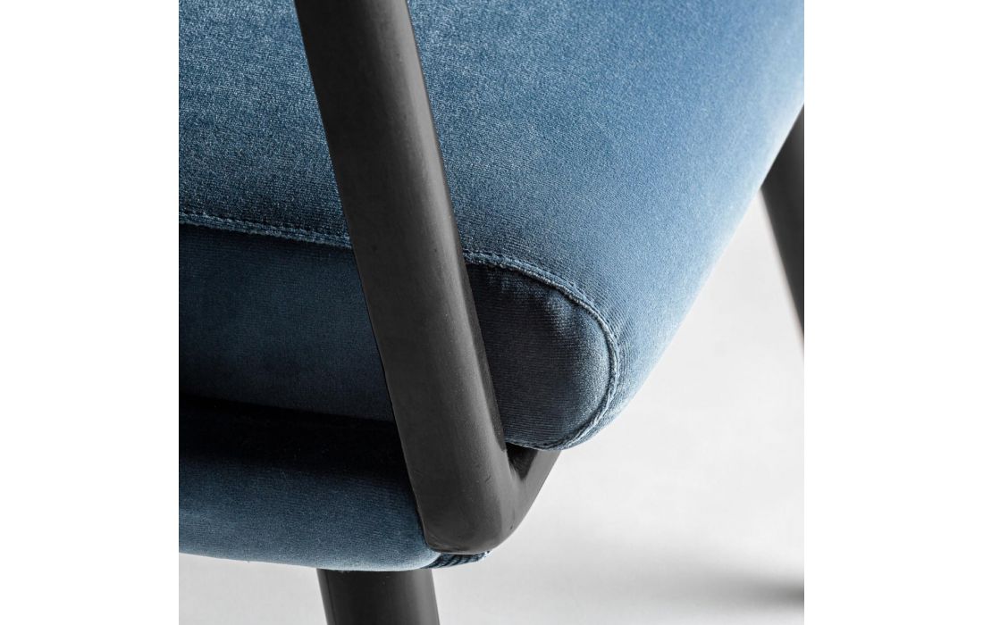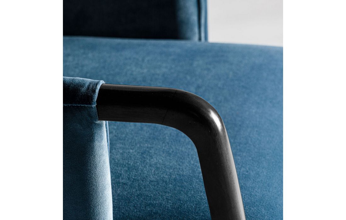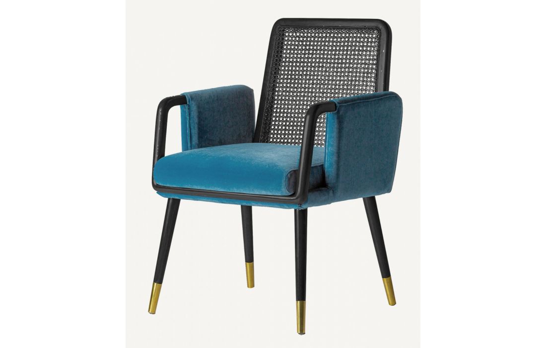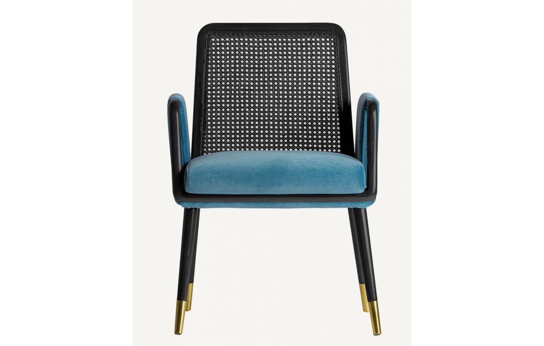 Armchair with walnut structure with golden metal detail on the feet and rattan on the back and cushioned in blue velvet fabric