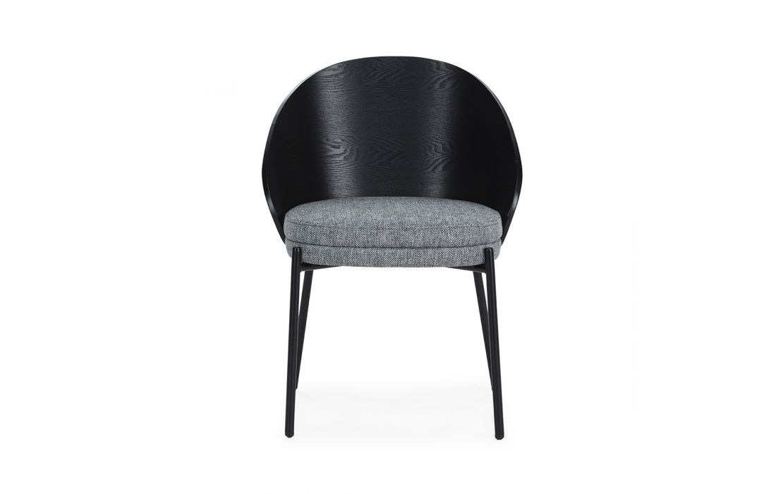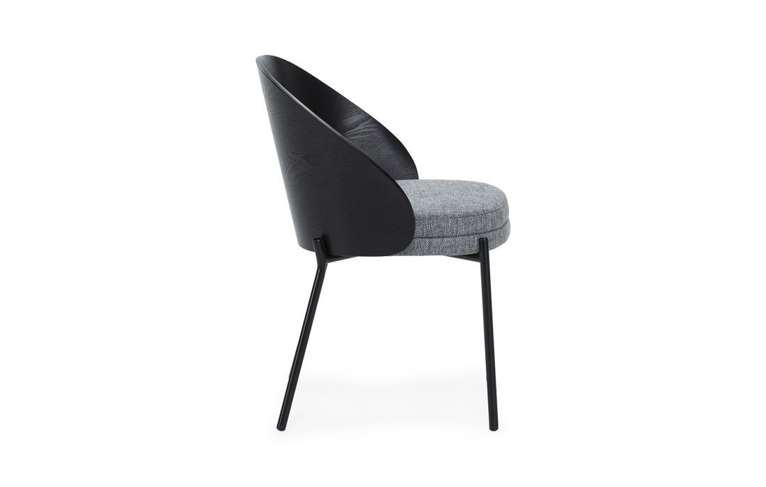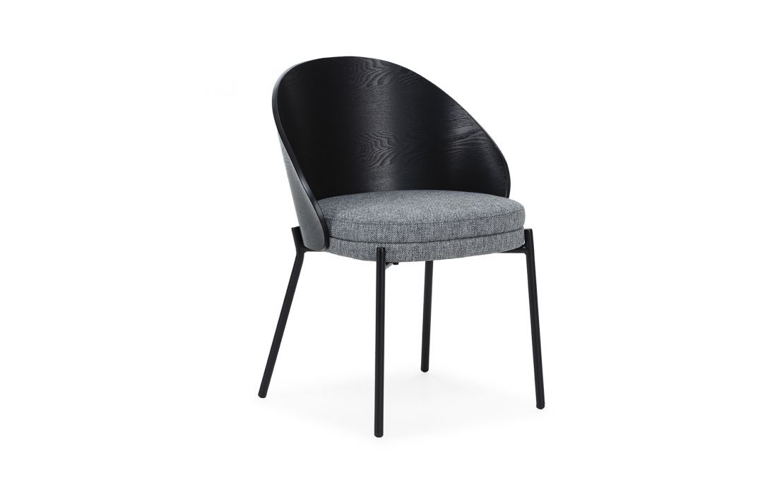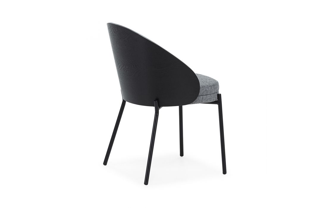 Chair in black wood, with gray fabric upholstery and black metal legs.