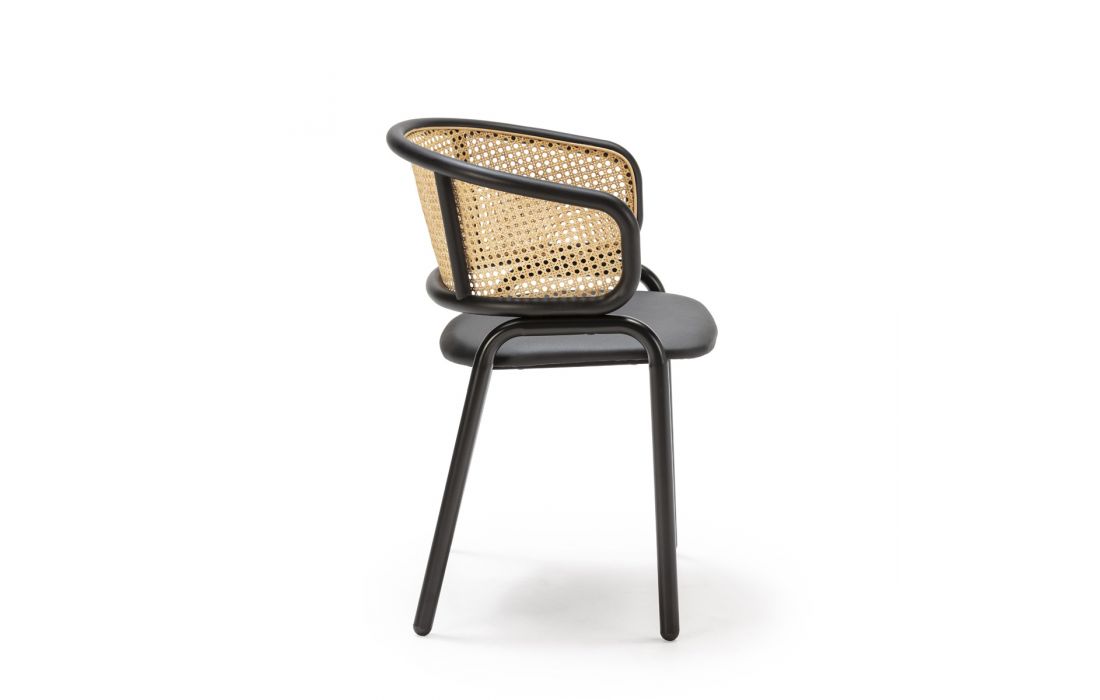 Chair with natural leather seat, rattan back and black metal legs.