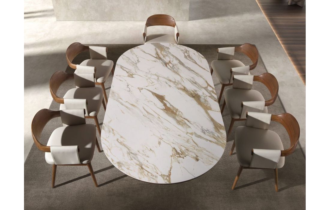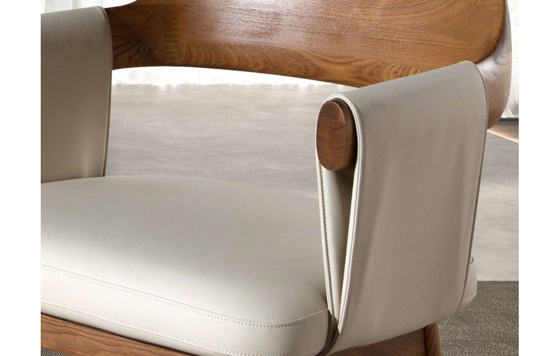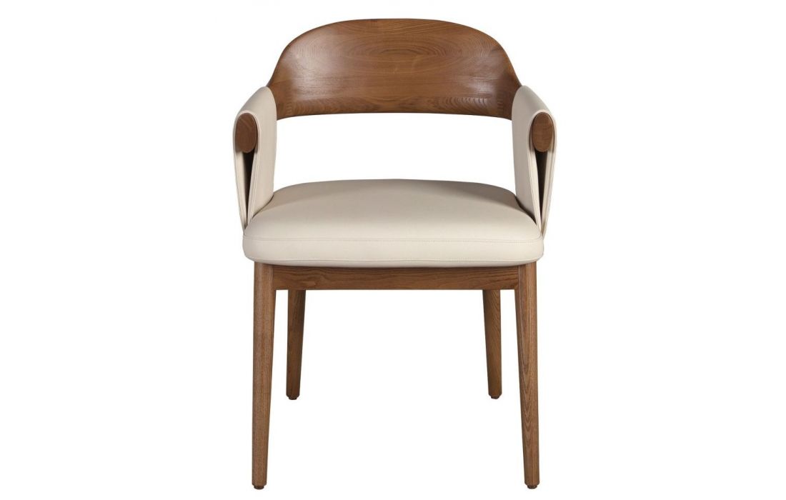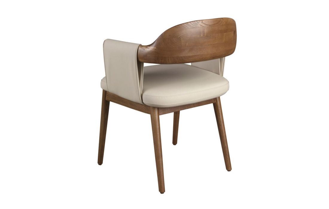 Modern design chair with arms, seat upholstered in synthetic leather and backrest in walnut color, its wooden legs in walnut color, avant-garde and timelessRecipient :