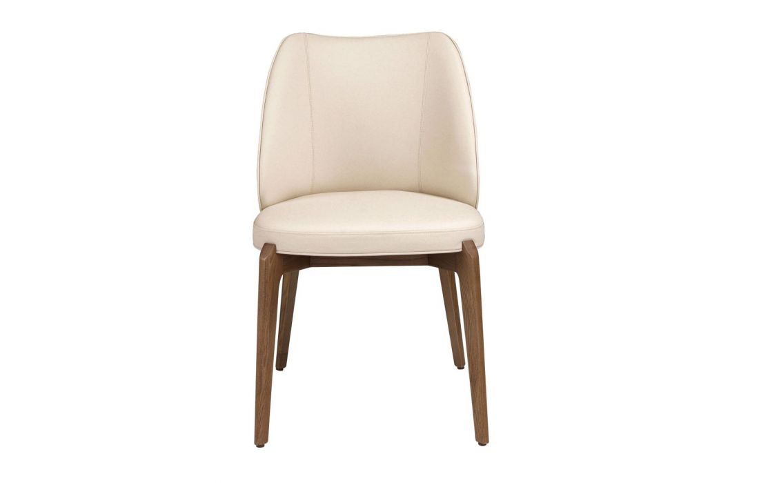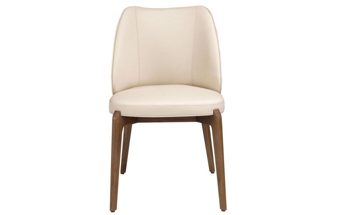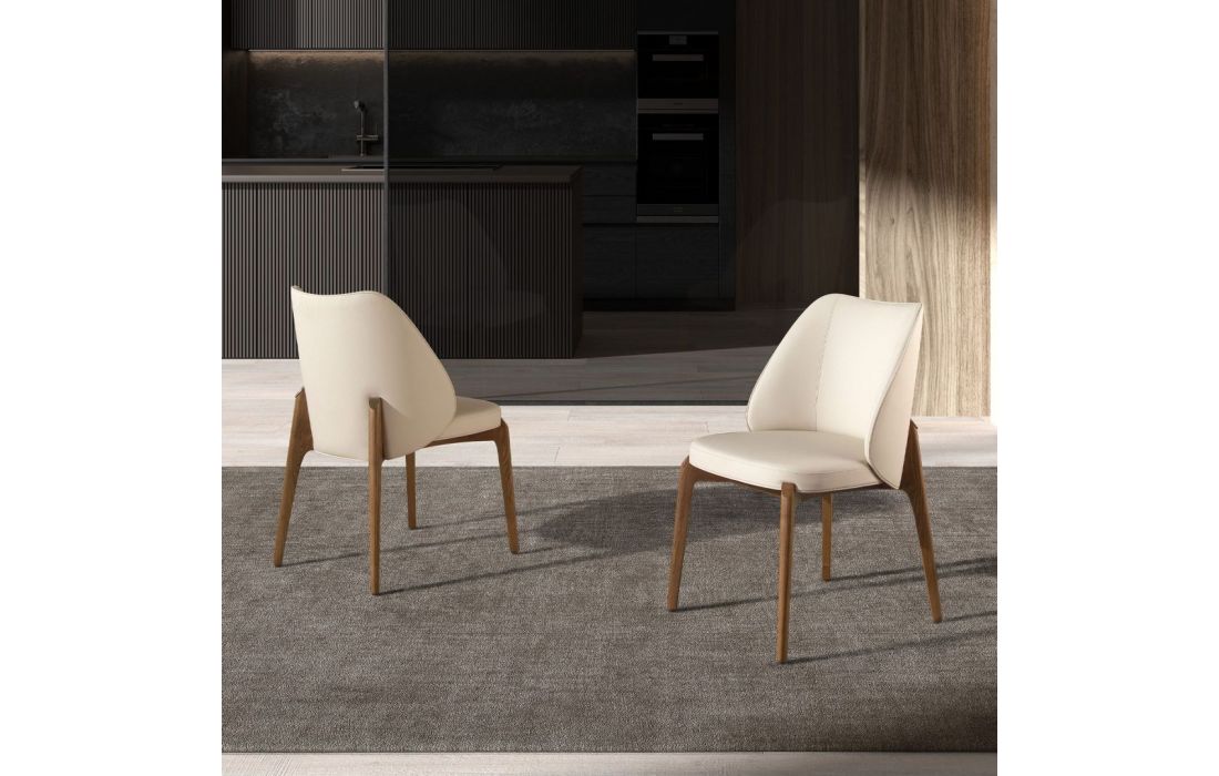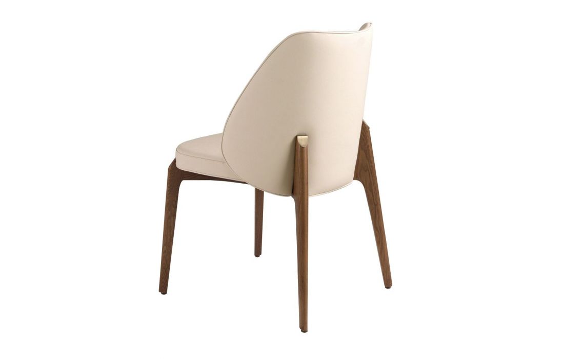 Modern design chair with seat and back upholstered in synthetic leather, polished stainless steel details and natural walnut veneered wood legs, offering an avant-garde and timeless styleRecipient :