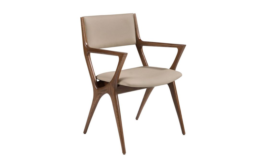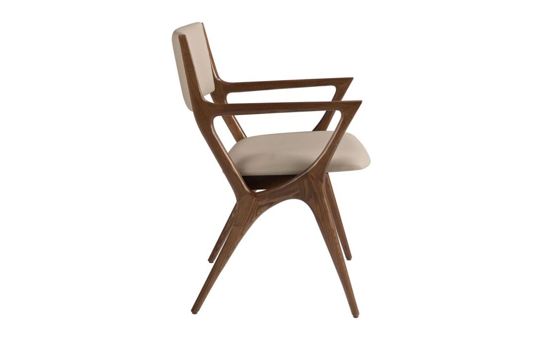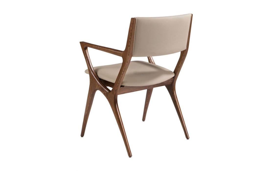 Modern design chair with arms, seat and back upholstered in synthetic leather and its wooden legs in walnut color, avant-garde and timelessRecipient :