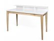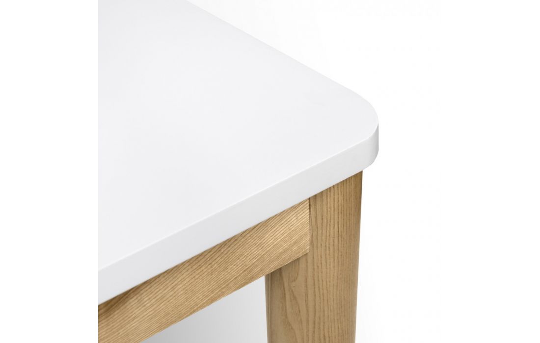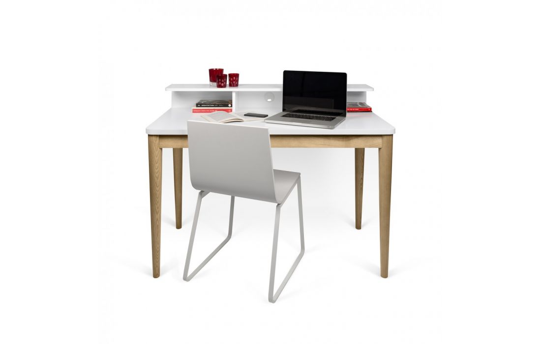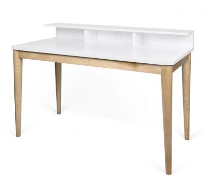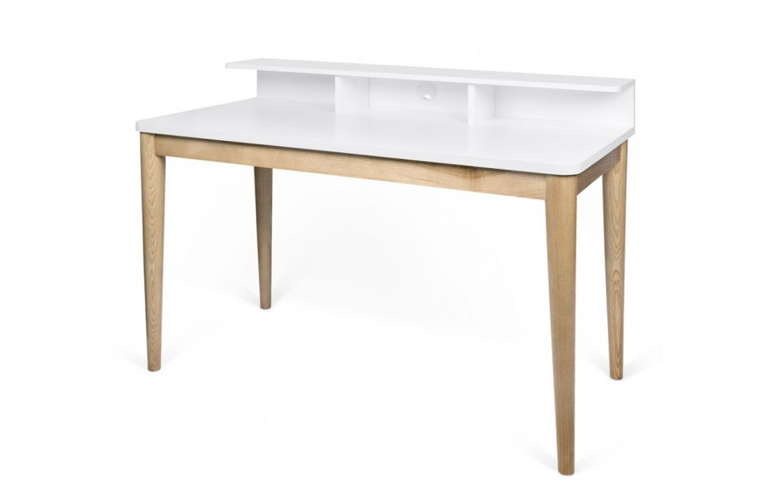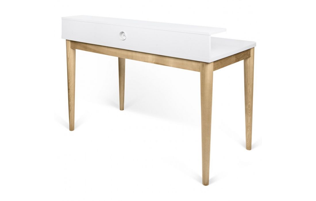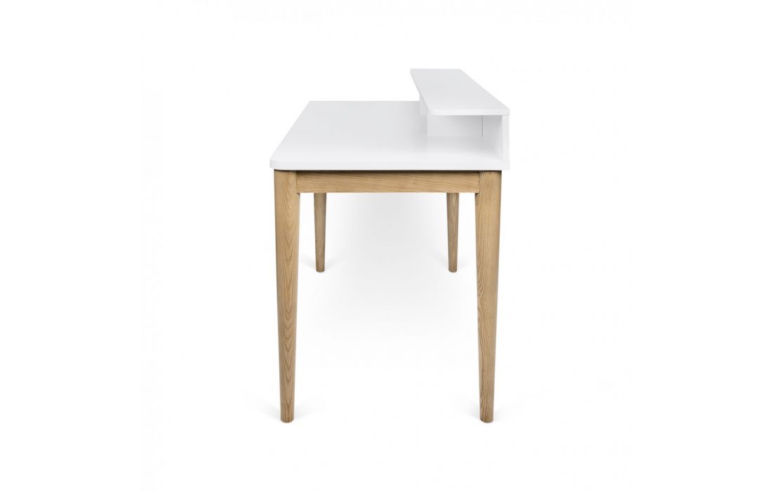 Bicolor retro style desk with base and legs in solid wood and white top.