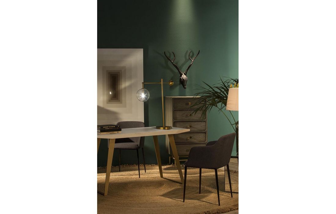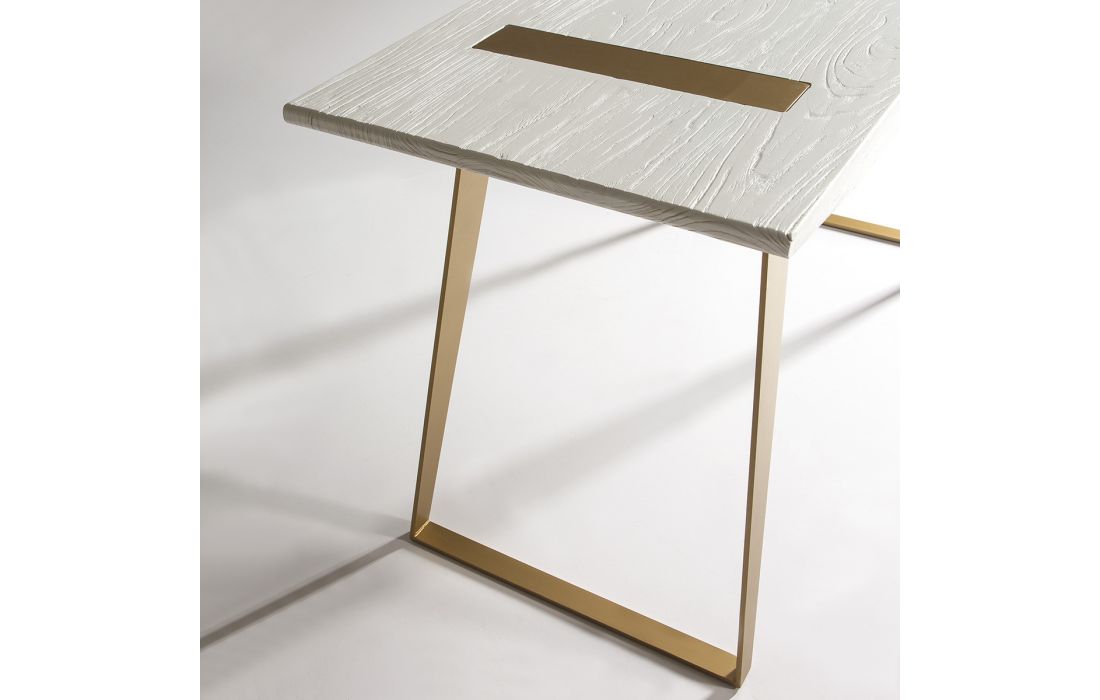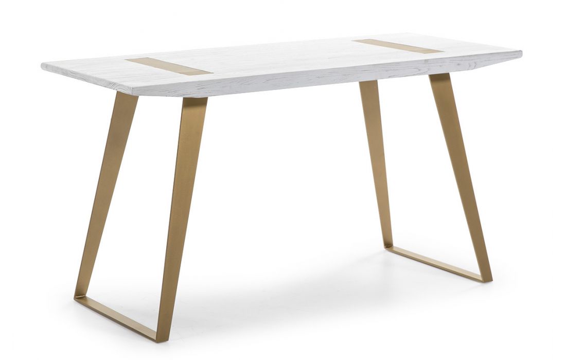 Desk with golden metal structure and white wood top.