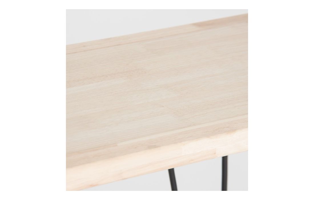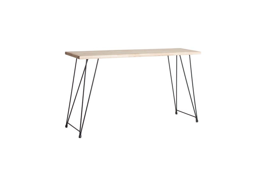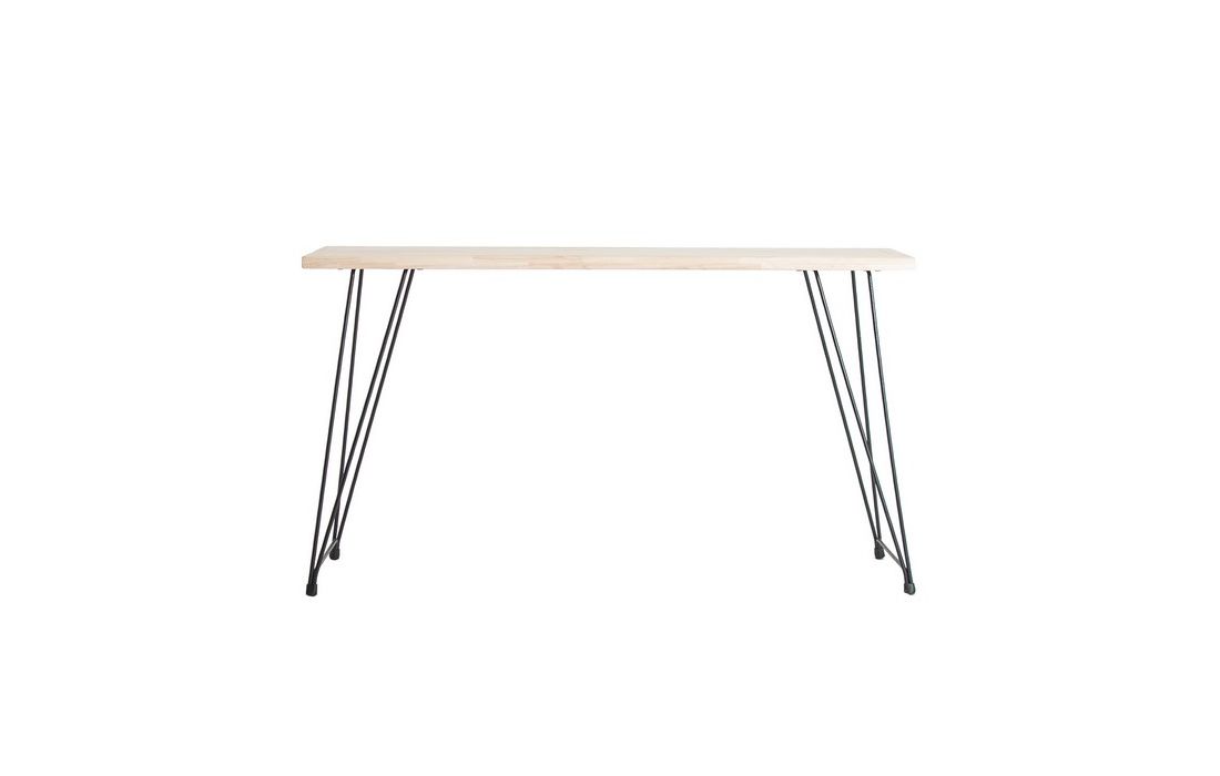 Desk with natural color fir wood top and black iron feet.