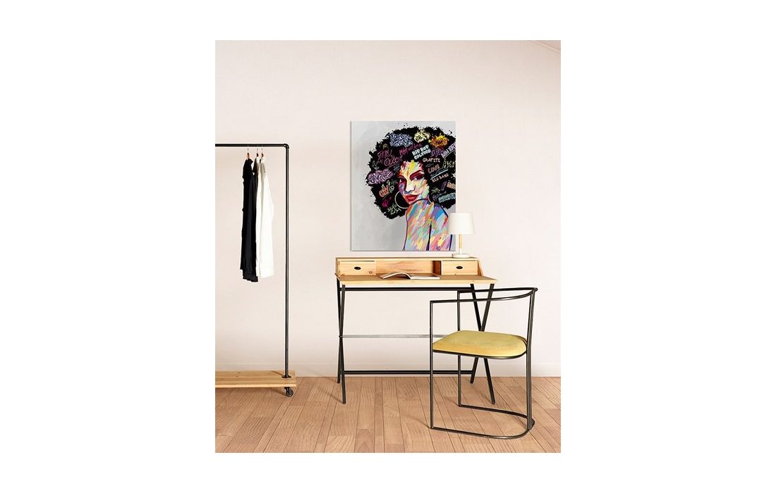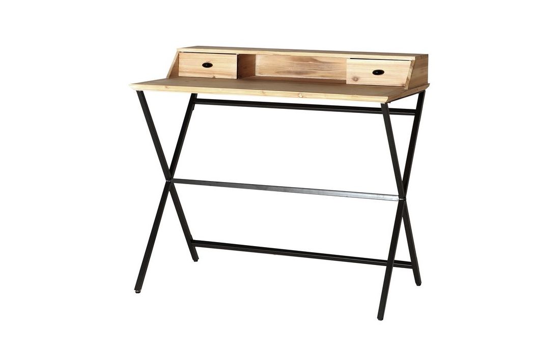 Desk made with a black metallic structure that supports the natural-colored spruce top.