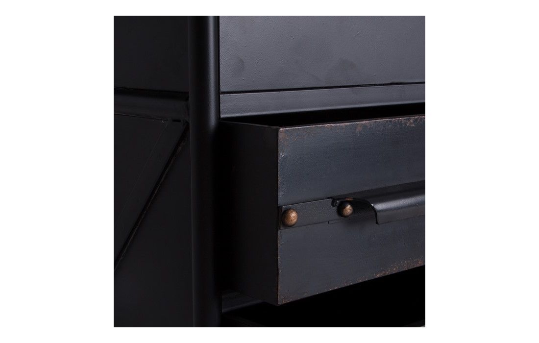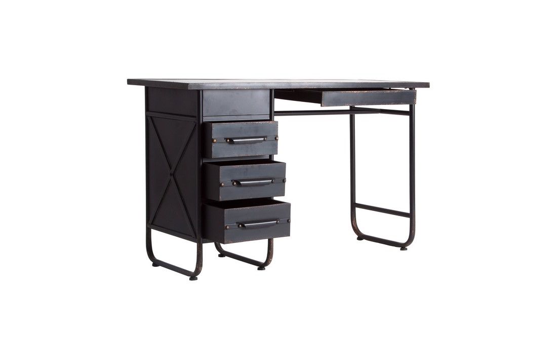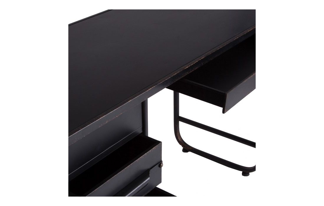 Desk made with a black metallic structure that has three drawers and a hole on the left.