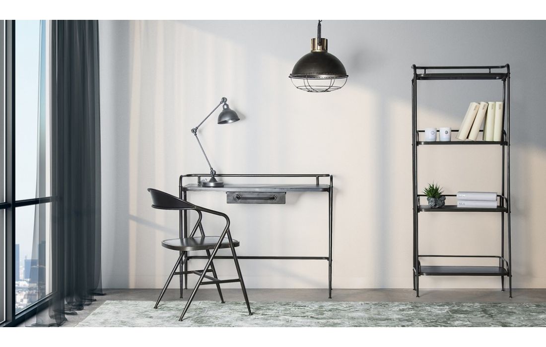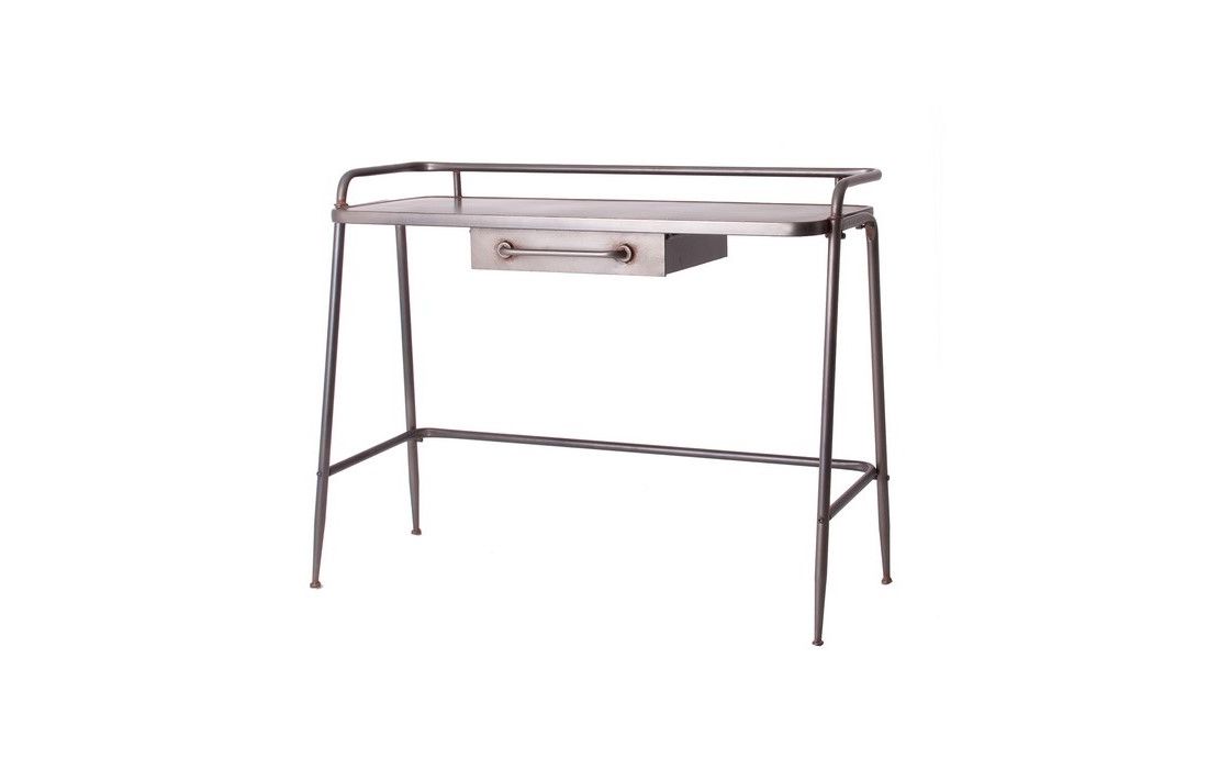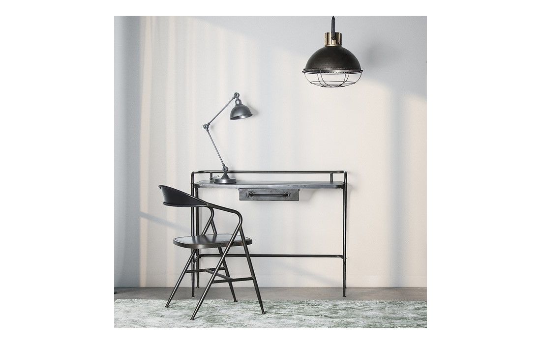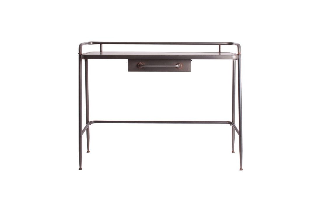 Desk made with a black metallic structure that contains a small drawer in the center.