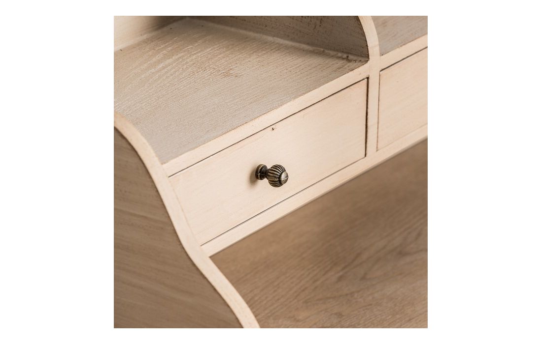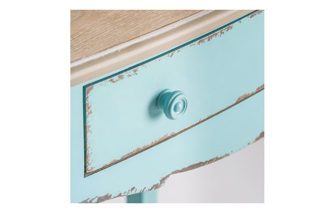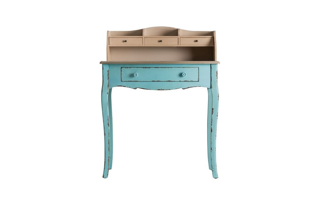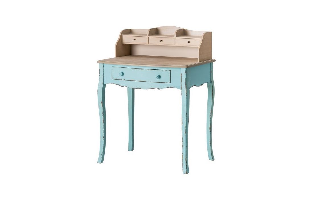 Desk made of natural fir wood and MDF. It has a natural color top and a turquoise blue structure with drawers.
