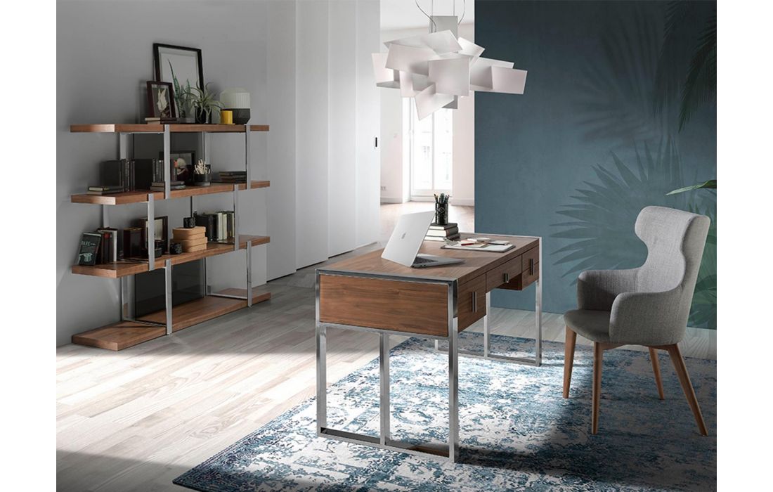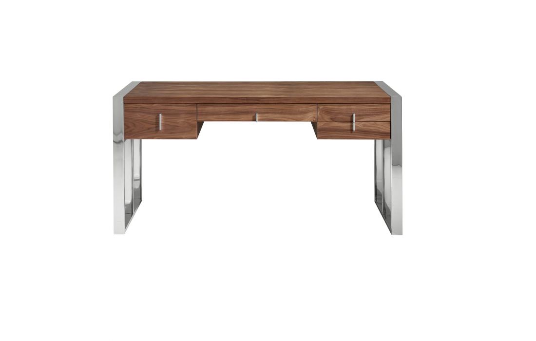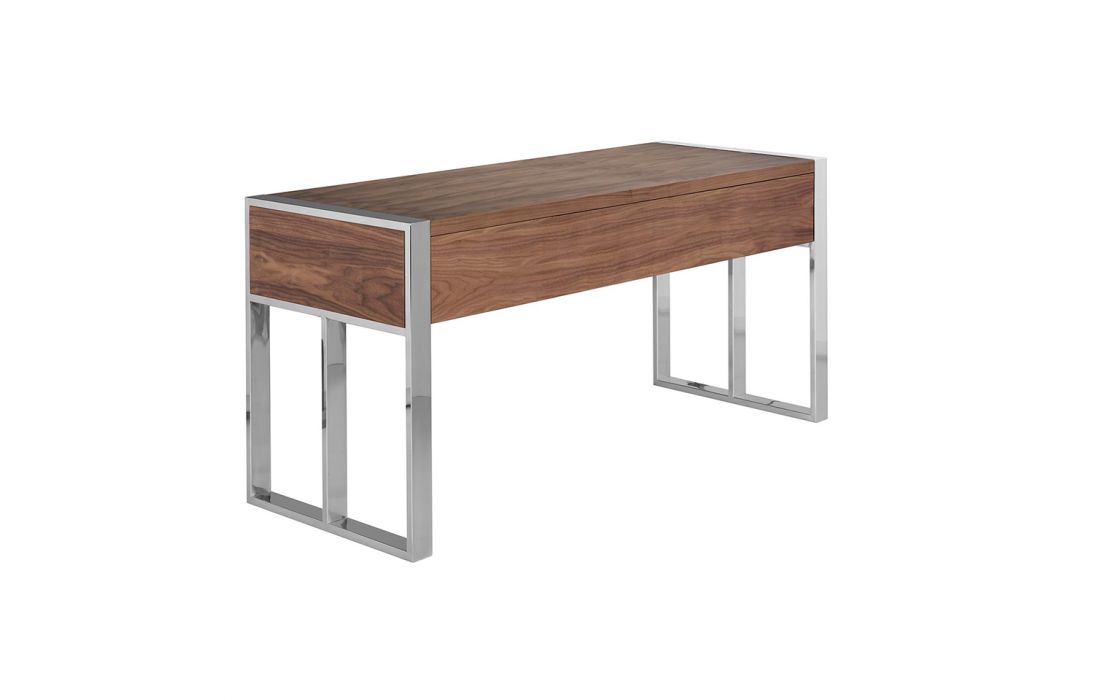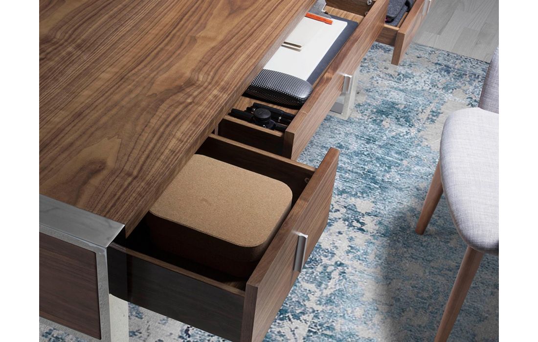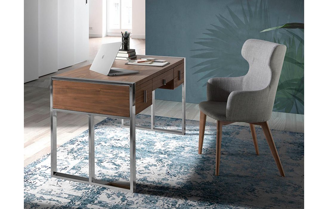 Desk with top and front drawers in walnut veneered wood. Gray handles and chromed steel feet.