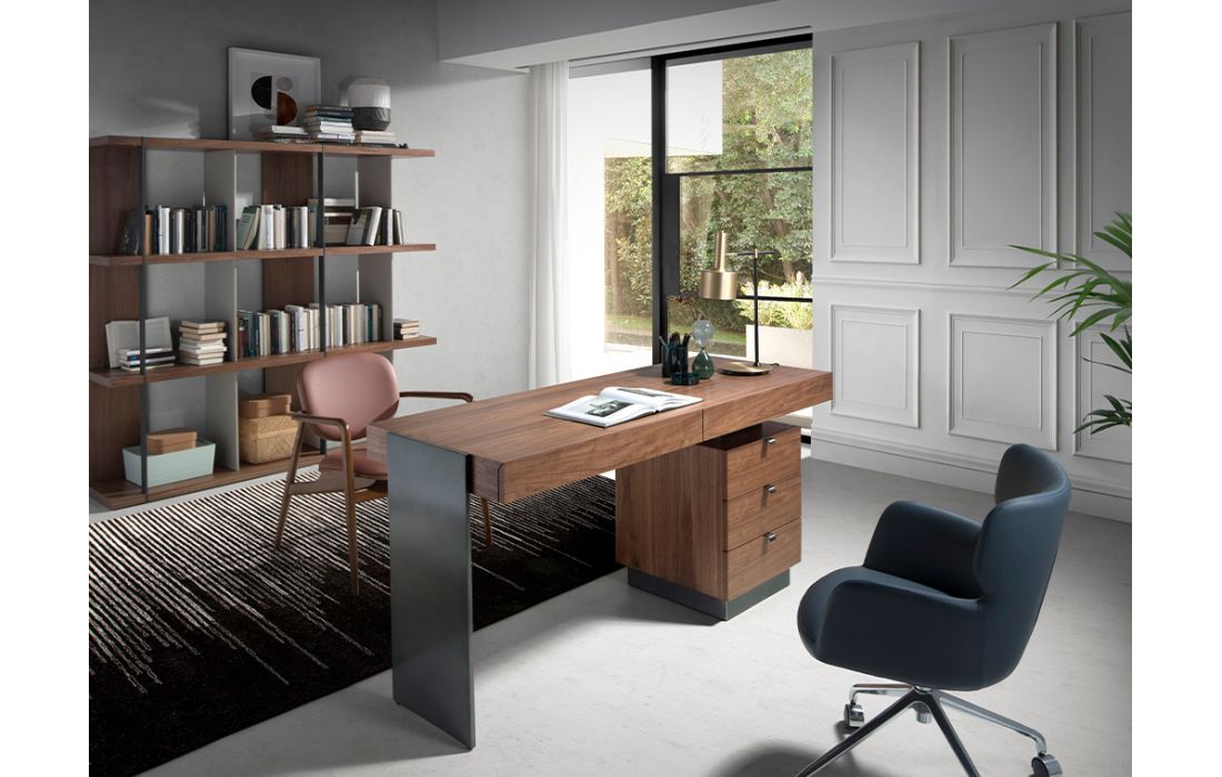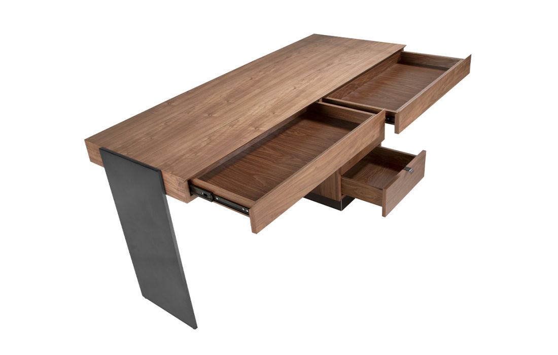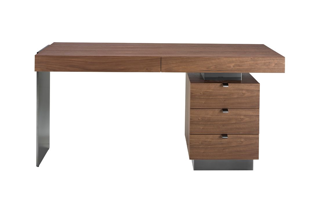 Secretary with 5 drawers, top and drawers in walnut veneer and leg structure and details in solid polished stainless steel