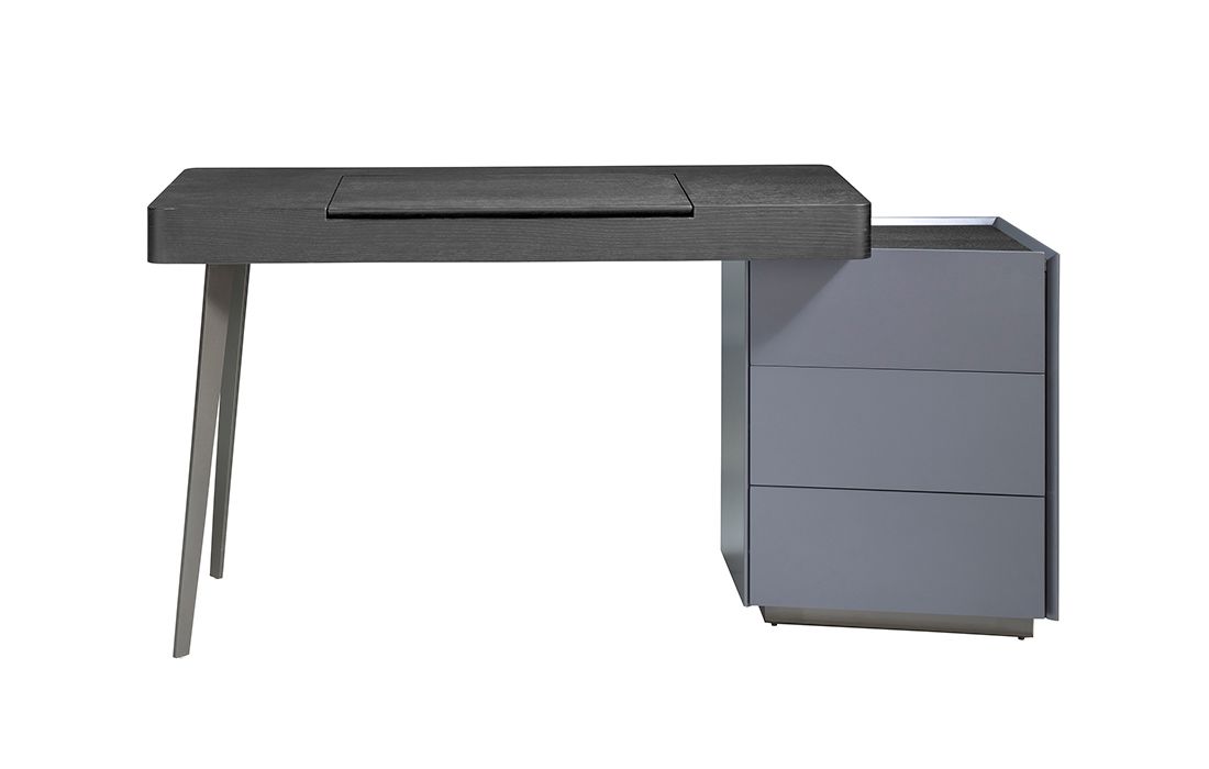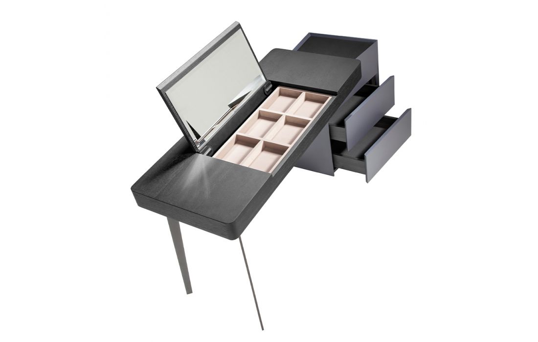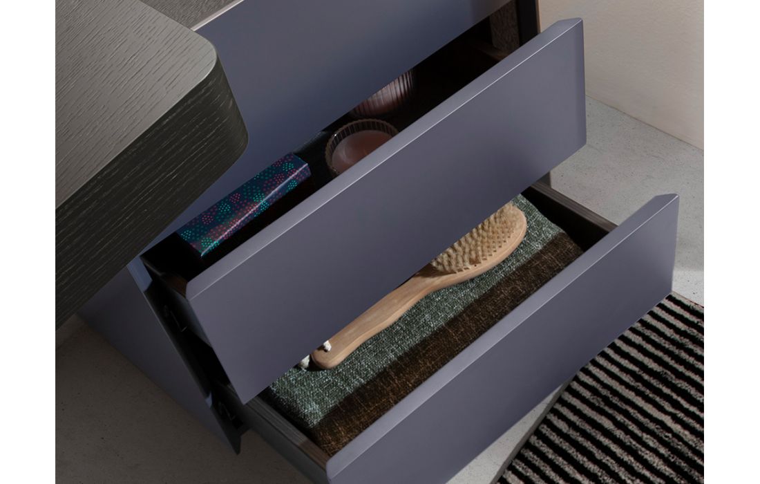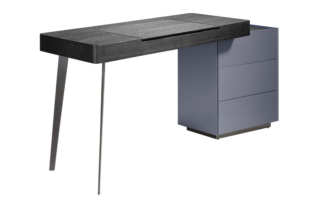 Secretary with 3 drawers vanity in blue lacquered wood and main module in black wenge wood with black stainless steel feet