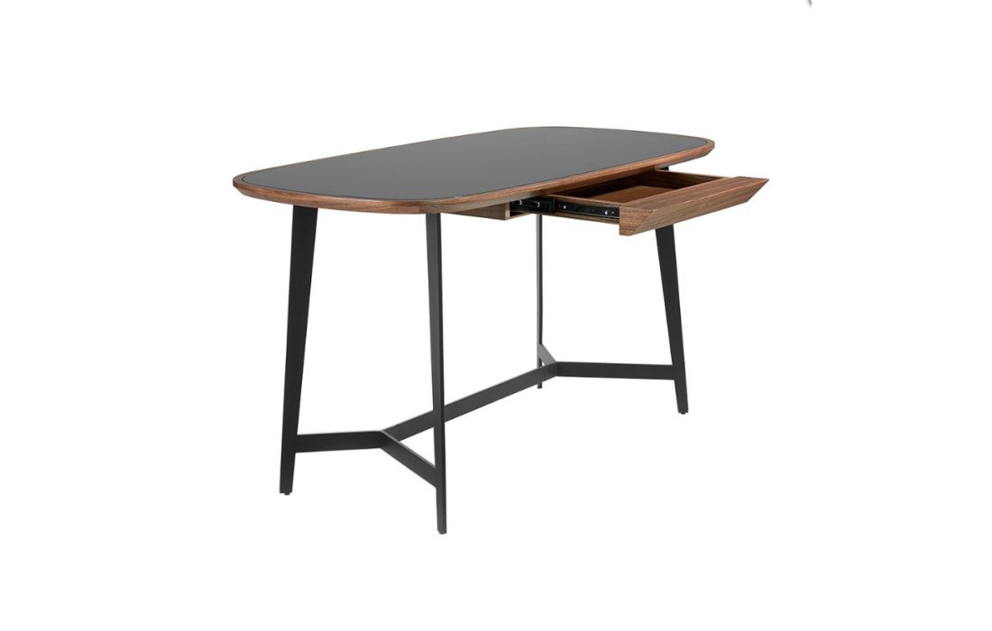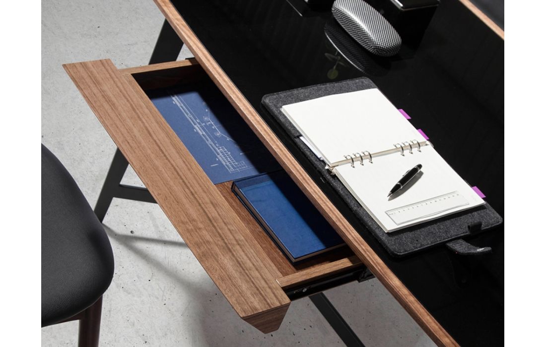Office table with walnut veneered wood top and black glass. Central drawer with walnut veneered wood top. Leg structure in steel painted with black epoxy