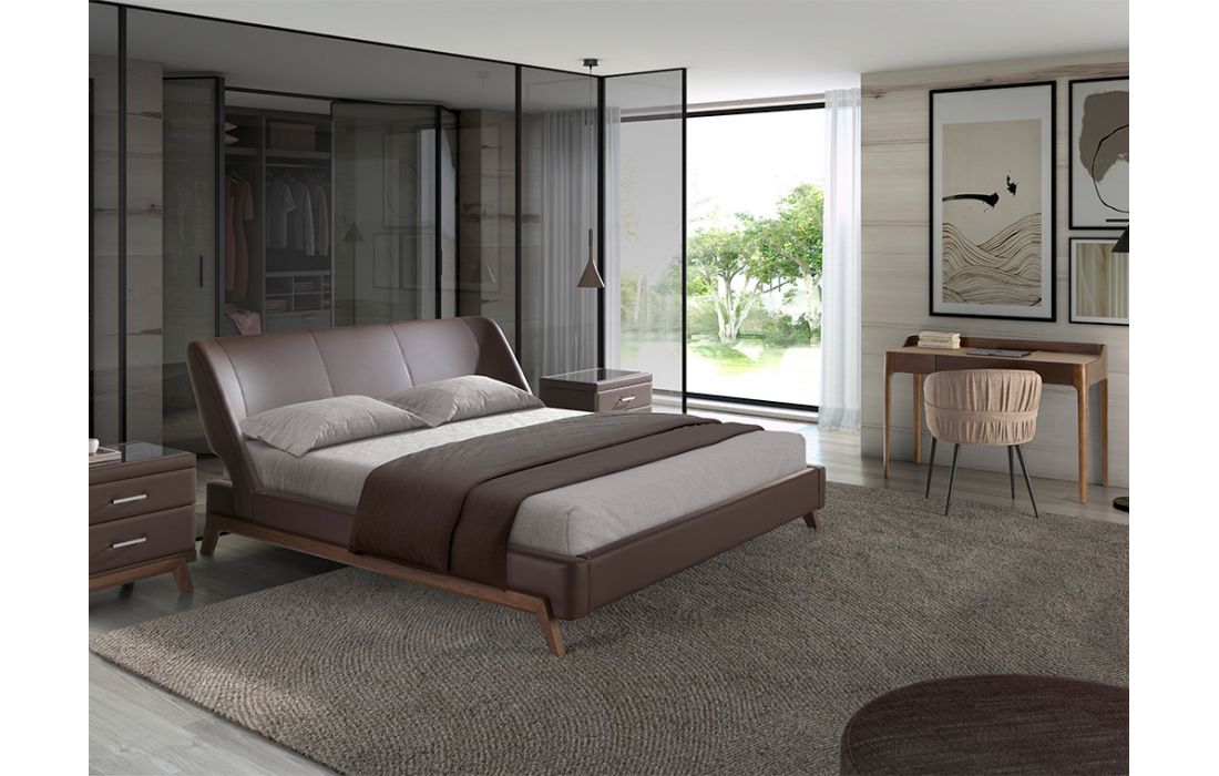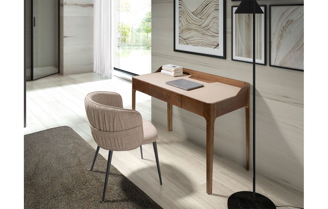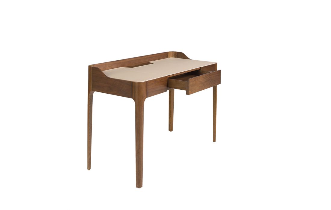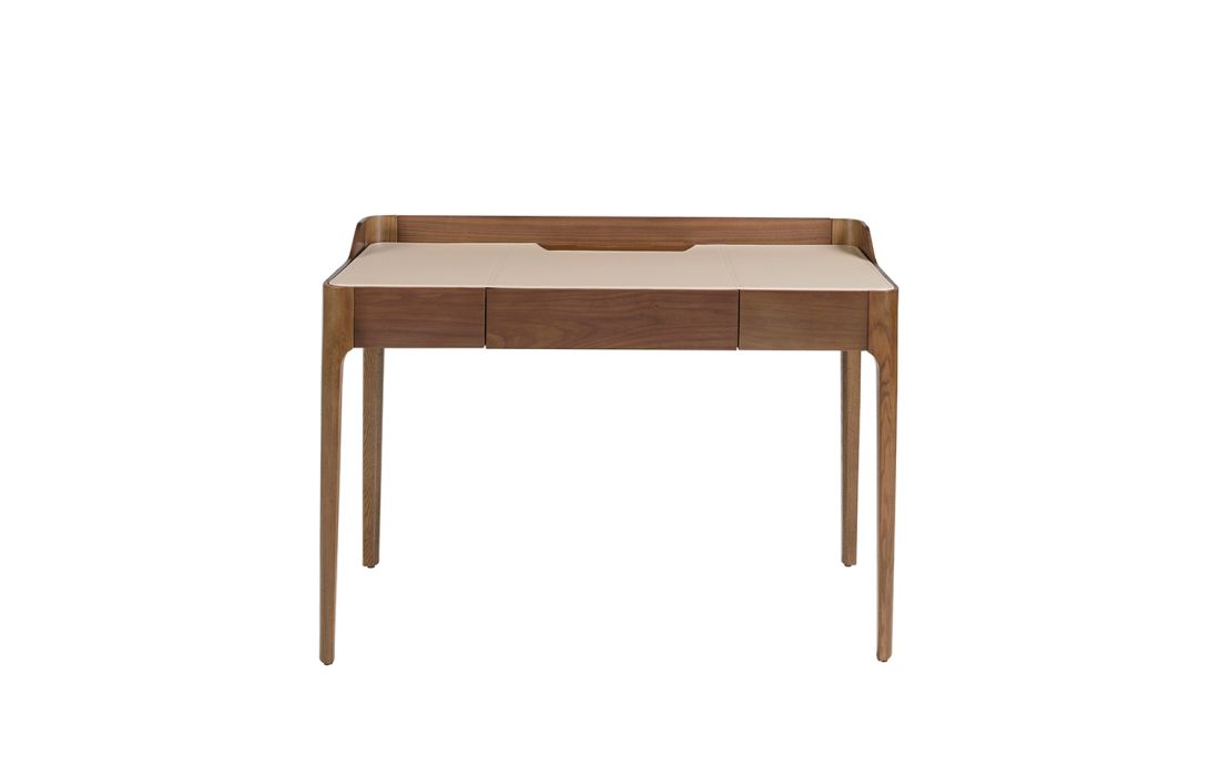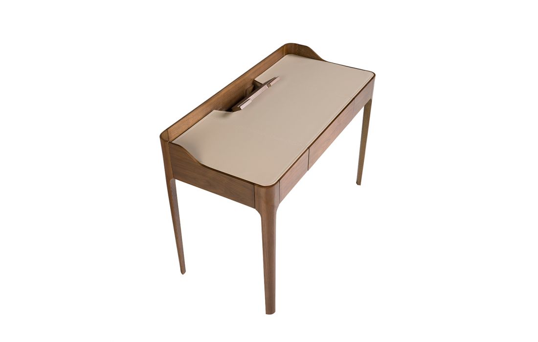 Desk in natural wood with walnut veneer with cream-colored synthetic leather upholstery.