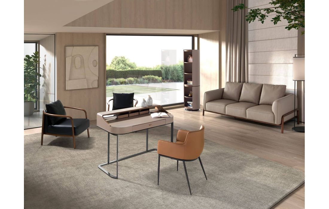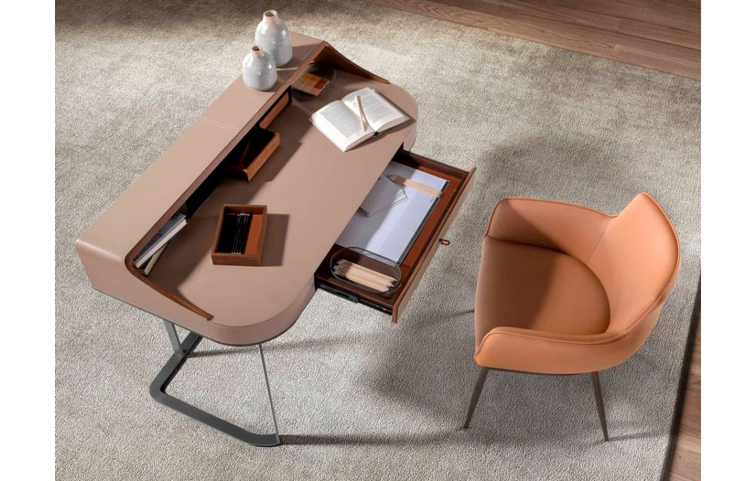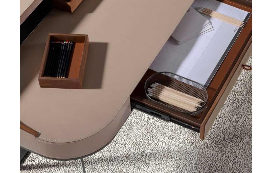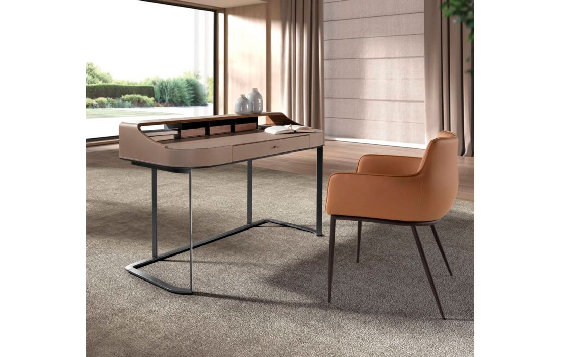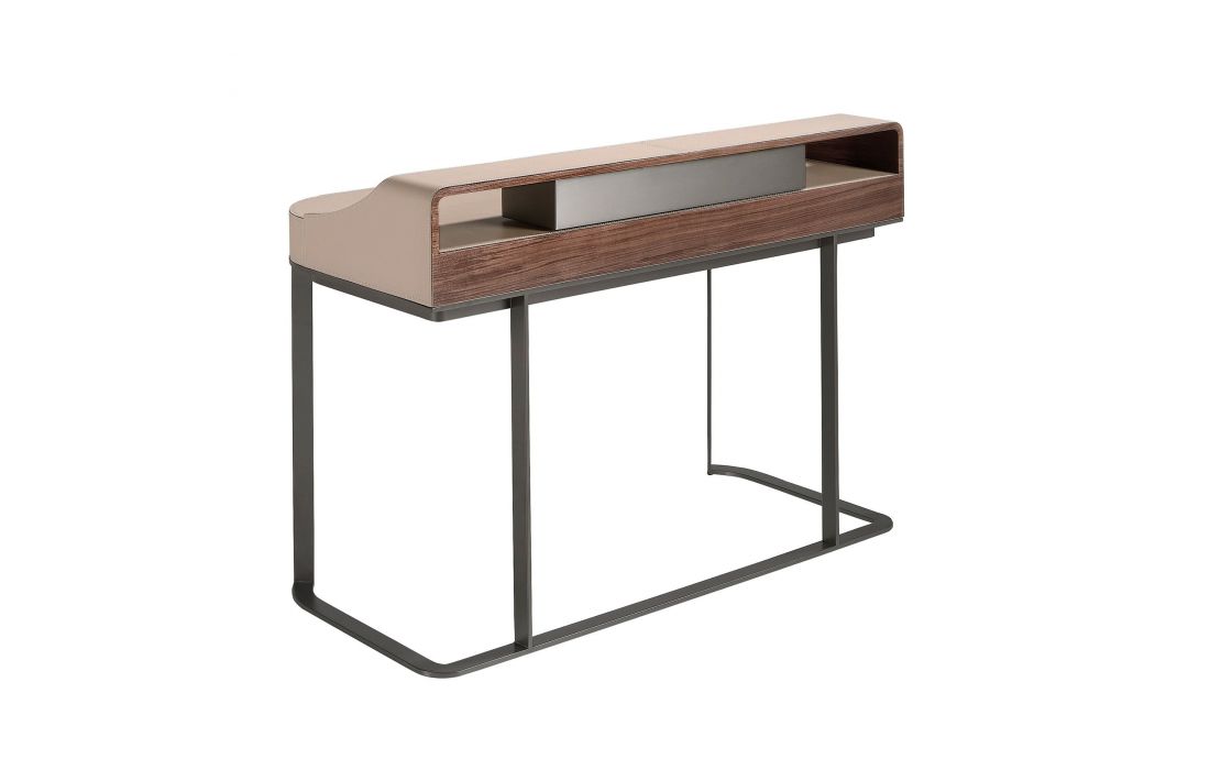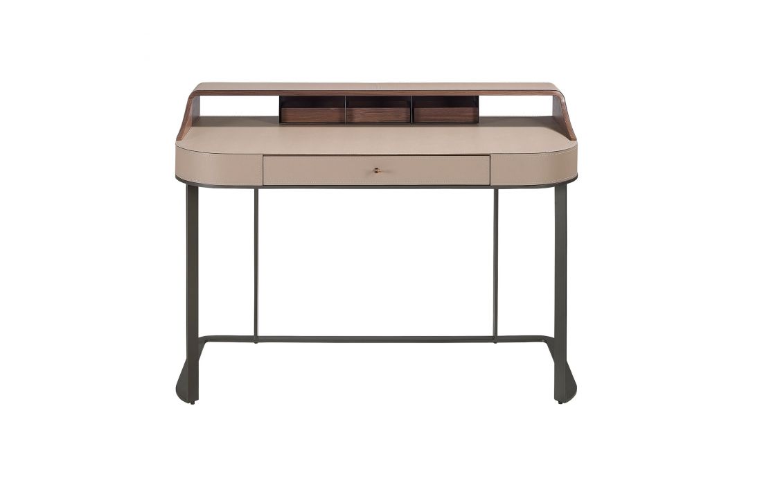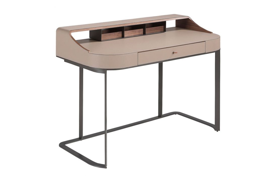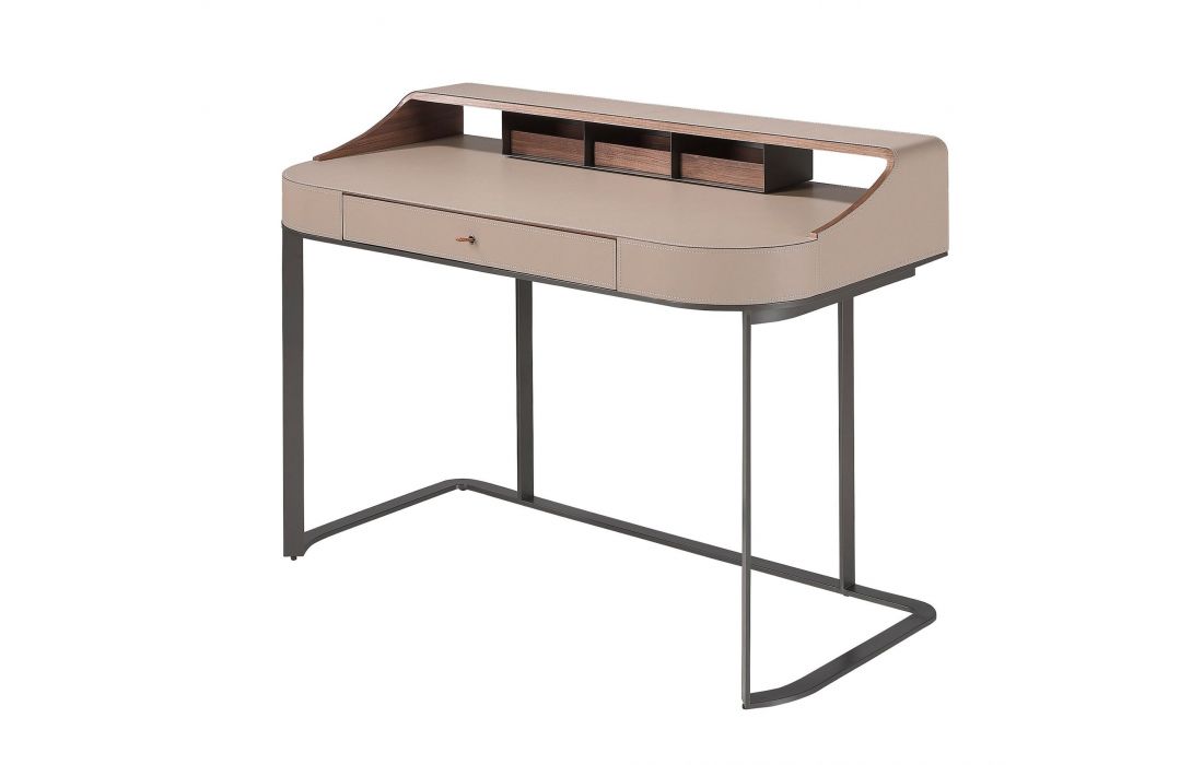 This modern dressing table desk is made of natural walnut veneer and upholstered in mink-colored faux leather. Its grey stainless steel legs add a sophisticated and exclusive touch to your bedroom.