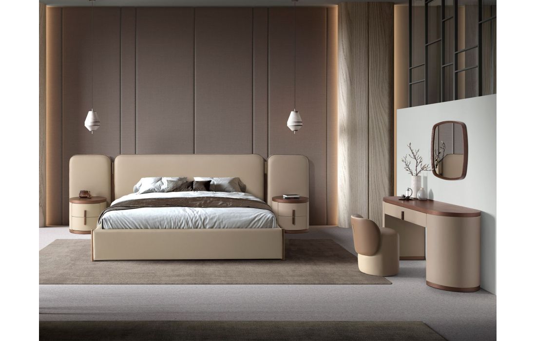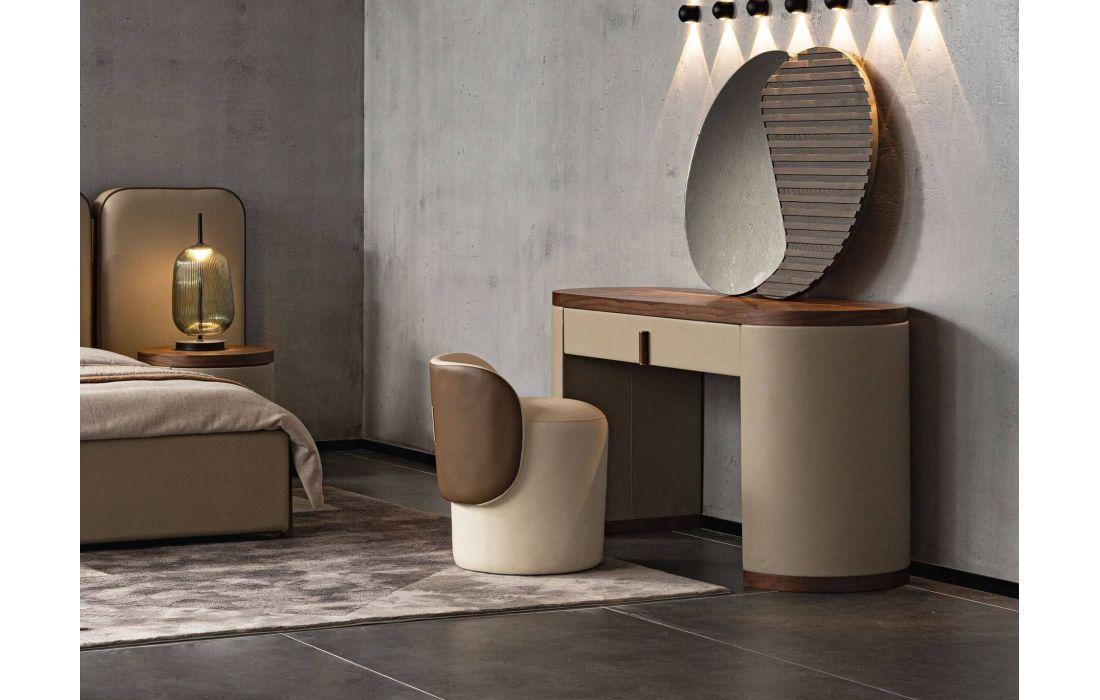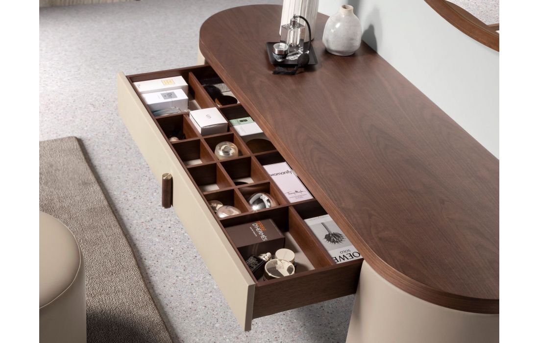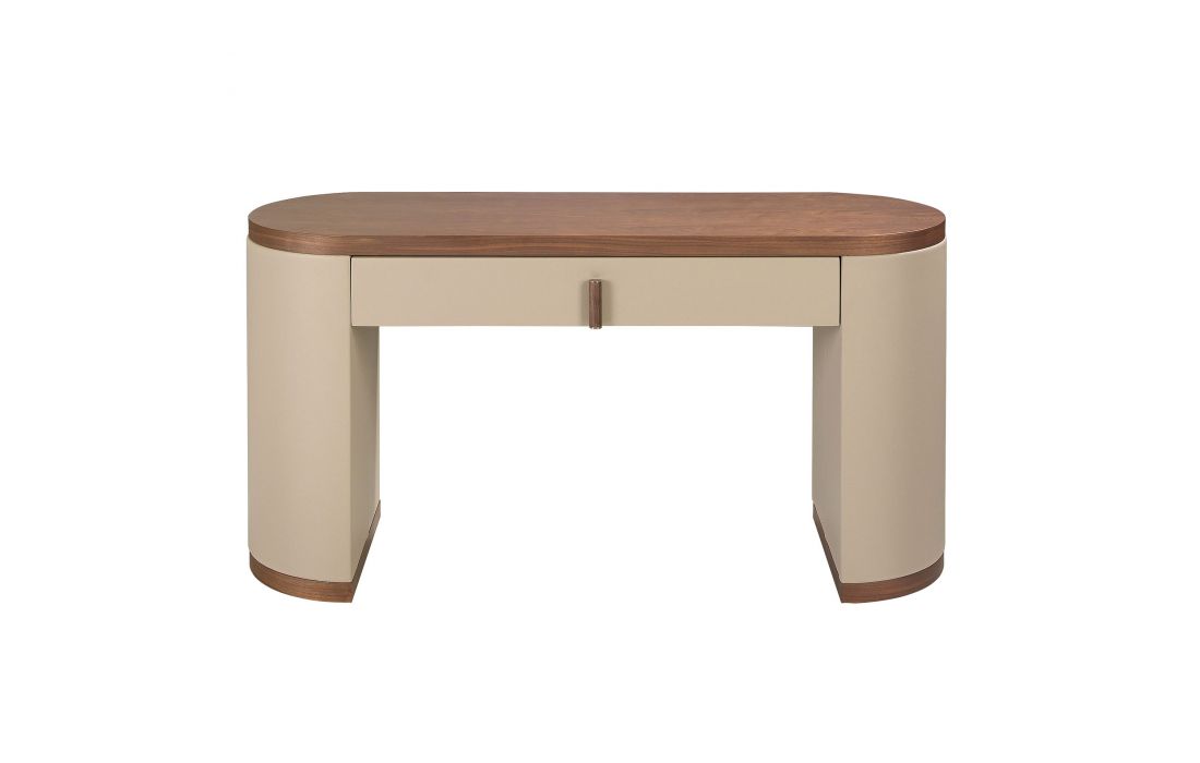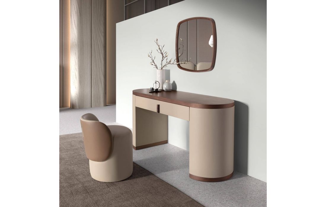 This modern dressing table desk in MDF, combined with elegant faux mink leather upholstery. The design of its wooden legs upholstered in mink-colored imitation leather will add a sophisticated and exclusive touch to your space. It also contains a drawer, perfect for your storage.