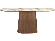 Consola oval moderna com acabamento brilhante, tampo em mármore e pés originais em folheado de nogueiraDimensões em cmC 180 P 45 A 78Prazo de Entrega10 a 20 dias