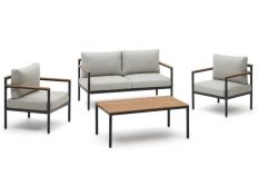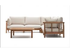 Conjunto de exterior composto por sofá de canto de 2 lugares , com 2 cadeirões e uma mesa de centro, com estrutura em aluminio , com os braços e o tampo da mesa em madeira de eucalipto , com almofadas em tecido cinza . Dimensões em cmL 62.5 P 55 A 66 ( Mesa )L 135 P 64 A 66 ( Sofá )L 100 P 64 A 66 ( Cadeirão )Prazo de Entrega10 a 15 dias
