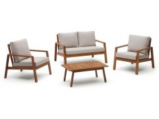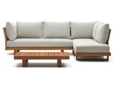 Conjunto de exterior composto por sofá de canto de 2 lugares , com 2 cadeirões e uma mesa de centro, com estrutura em madeira maciça de acácia e almofadas em tecido cinza Dimensões em cmL 70 P 50 A 77 ( Mesa )L 126 P 85 A 77 ( Sofá )L 90 P 85 A 77 ( Cadeirão )Prazo de Entrega10 a 15 dias