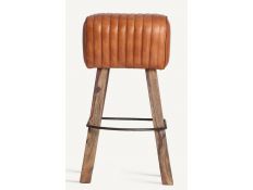 Banco bar estilo vintage feito em madeira de acácia, ferro e couro na sua cor natural e preta Prazo de Entrega10 a 20 diasDimensões em cmL 40 P 40 A 69