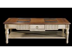 Prazo de entrega: 30 a 45 diasMesa de centro retangular com 2 gavetas, abertura superior com pormenores de mármore, design provençal com possibilidade de vários acabamentos.
