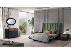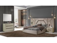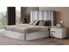 Prazo de entrega30 a 45 diasDimensões em cmsCama para colchão 150 x 195C 293 A 130  P 209Mesa de cabeceiraC 60  A 51  P 45CómodaC 130  A 85  P 50MolduraC 120 A 80  P 2.5Acabamento igual à imagemLacado cinza mate e pormenores em nogueira, estofo da cabeceira da cama em tecido
