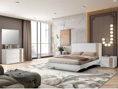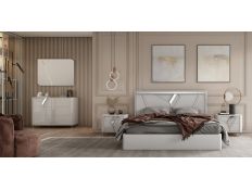 Prazo de entrega30 a 45 diasDimensões em cmsCama para colchão 150 x 195C 293 A 130  P 209Mesa de cabeceiraC 60  A 51  P 45CómodaC 130  A 85  P 50MolduraC 120 A 80  P 2.5Acabamento igual à imagemLacado branco mate e carvalho, estofo da cabeceira da cama em tecido