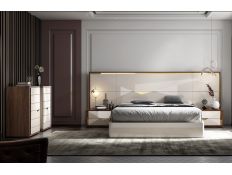 Prazo de entrega30 a 45 diasDimensões em cmsCama para colchão 150 x 195C 293 A 130  P 209Mesa de cabeceiraC 60  A 51  P 45CómodaC 130  A 85  P 50MolduraC 120 A 80  P 2.5Acabamento igual à imagemLacado branco mate e pormenores em dourado, estofo da cabeceira da cama em tecido