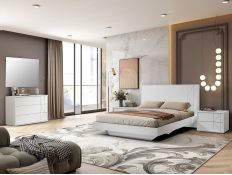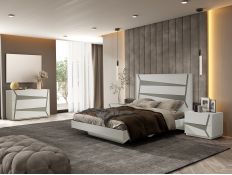 Prazo de Entrega30 a 45 dias Dimensões em cms Cama p/ colchão 150x195 C 170 A 125  P 210Mesa de cabeceira C 65  A 48  P 42Cómoda C 130  A 90  P 50Moldura C 120 A 80  P 3Acabamento igual à imagem: Lacado branco mate com pormenores em carvalho