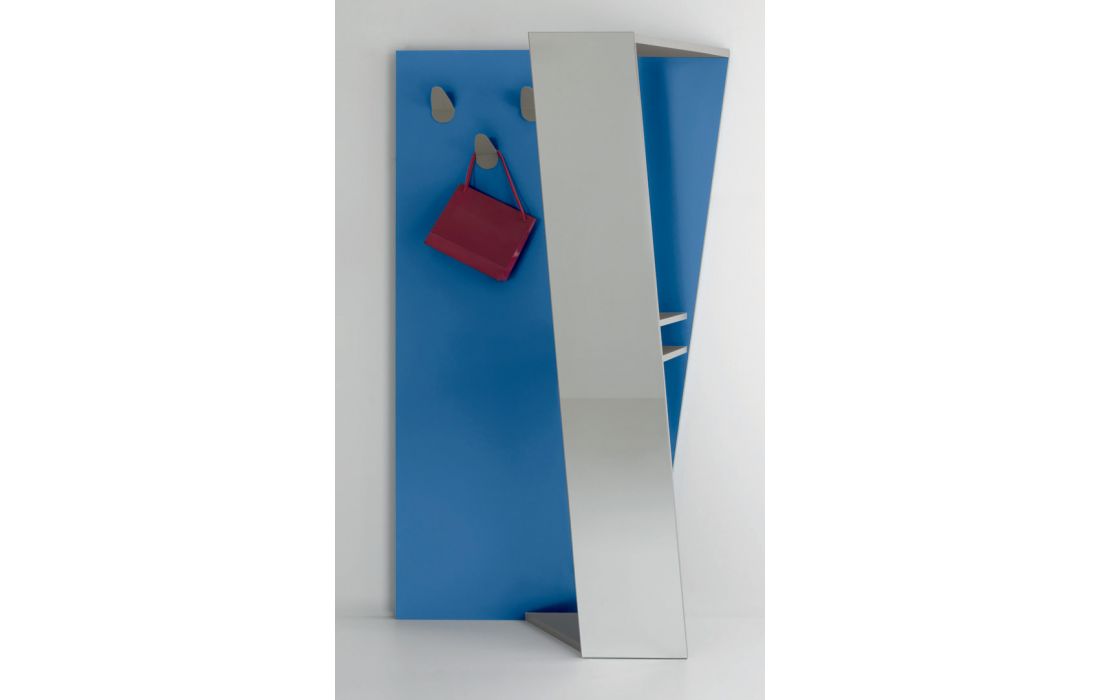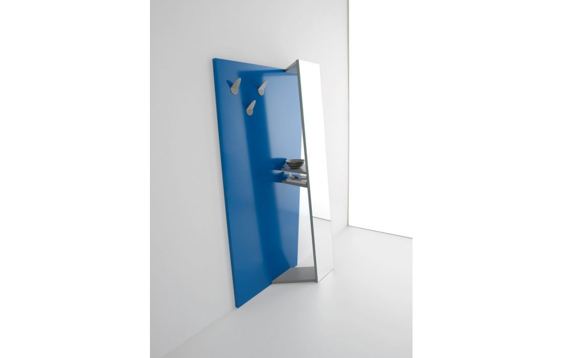 Bengaleiro de parade em MDF de cor branco ou azul com espelho frontal em lacado cinza com 2 prateleiras e 3 cabides em metal cinza