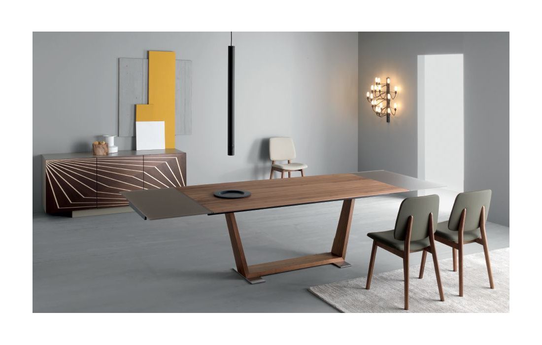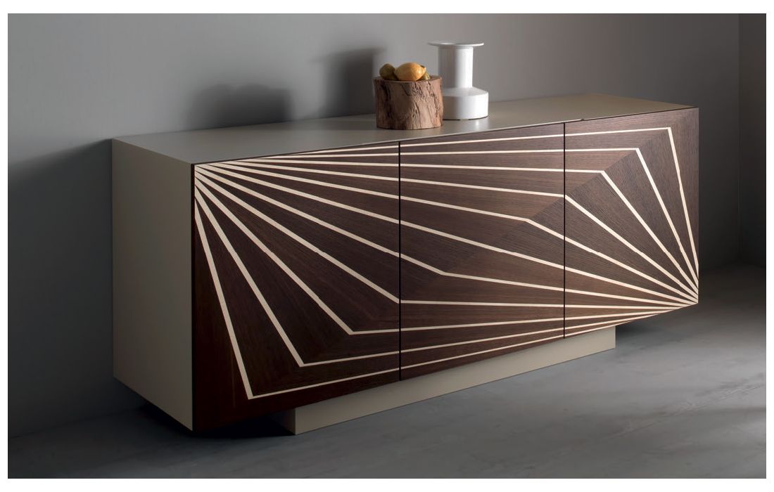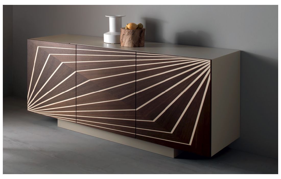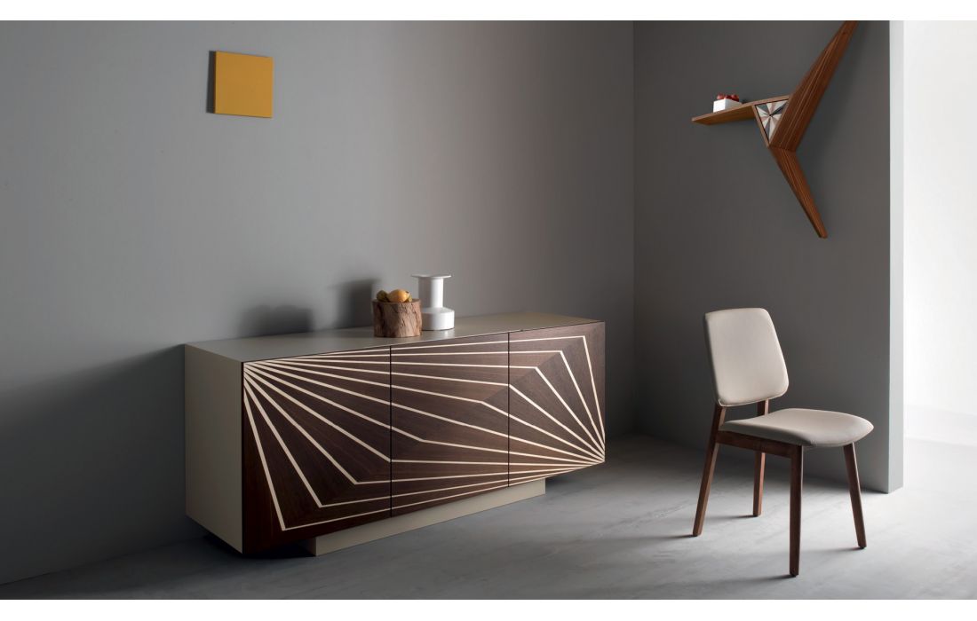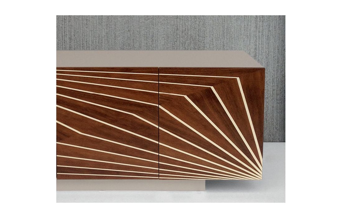 Aparador em MDF com estrutura em lacado mate sand com opção de portas em folha de madeira de carvalho queimado ou nogueira com aplicações em maple.