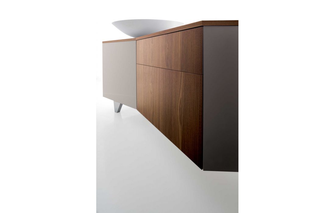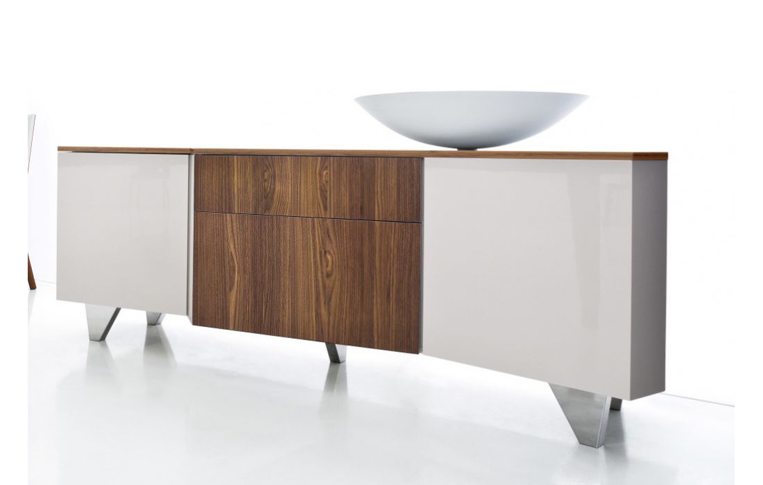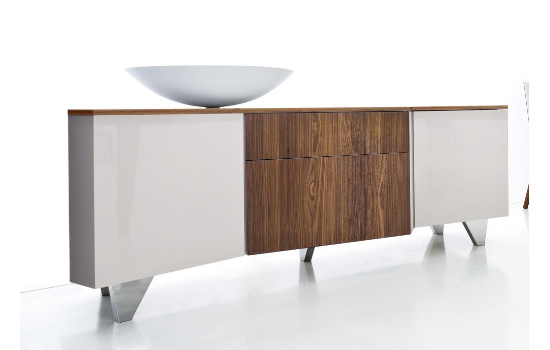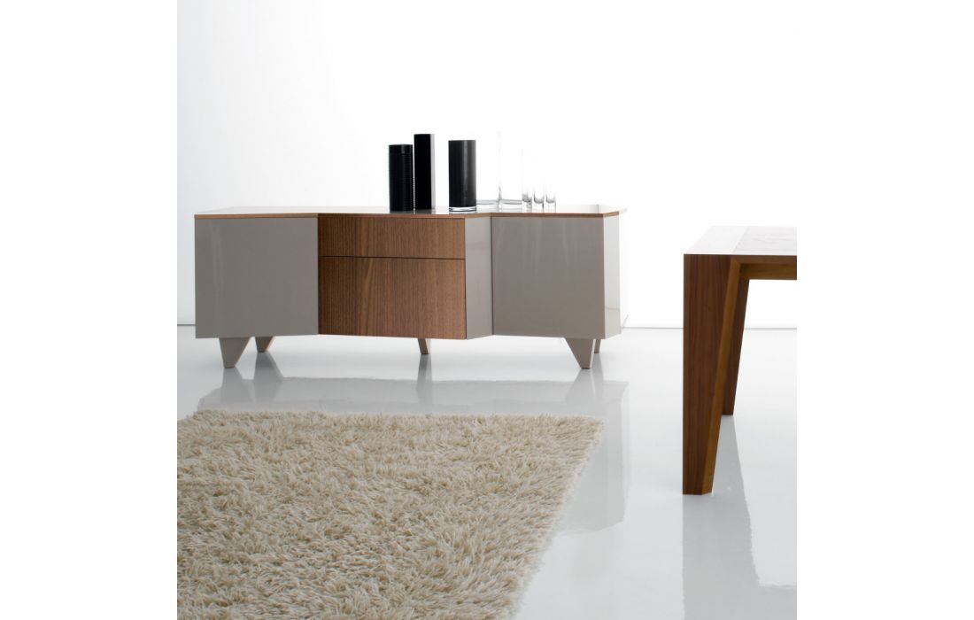 Aparador de 2 portas e 2 gavetas com estrutura em lacado bege com promenor de nogueira