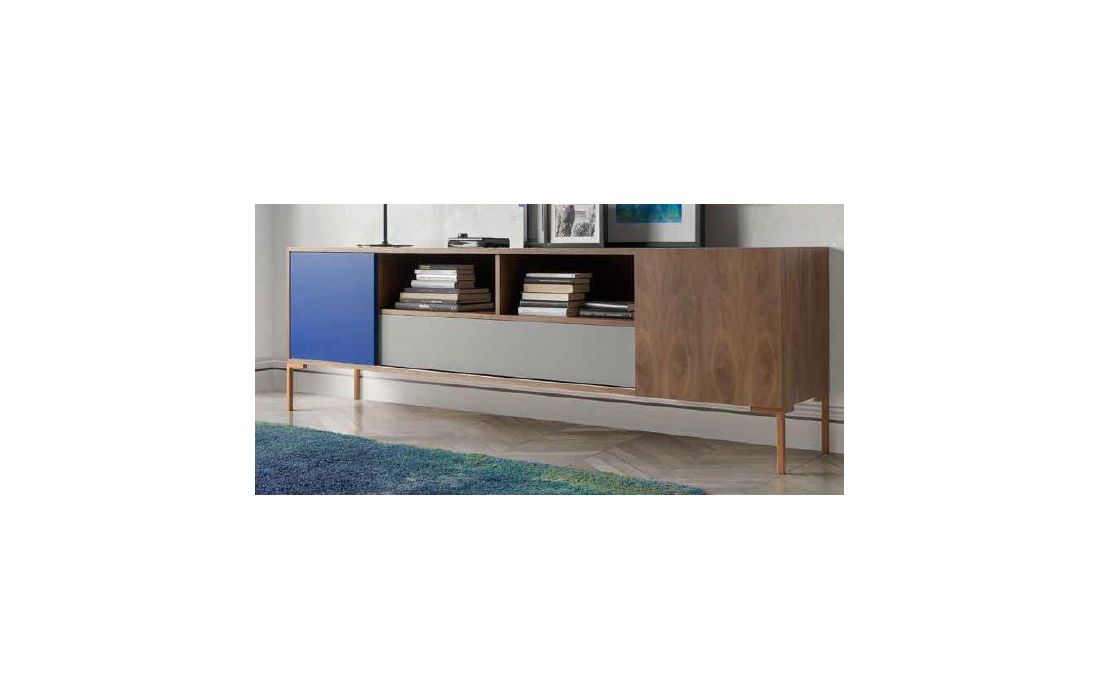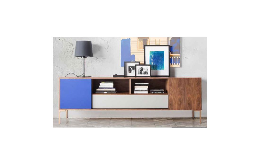 Aparador com 2 portas e 1 gaveta, estrutura em nogueira com acabamento em azul e taupe, pés em metal cobre.