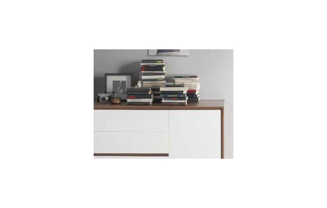 Aparador com 2 portas e 3 gavetas, estrutura em nogueira, frentes de portas e gavetas com acabamento em branco efeito de pele.