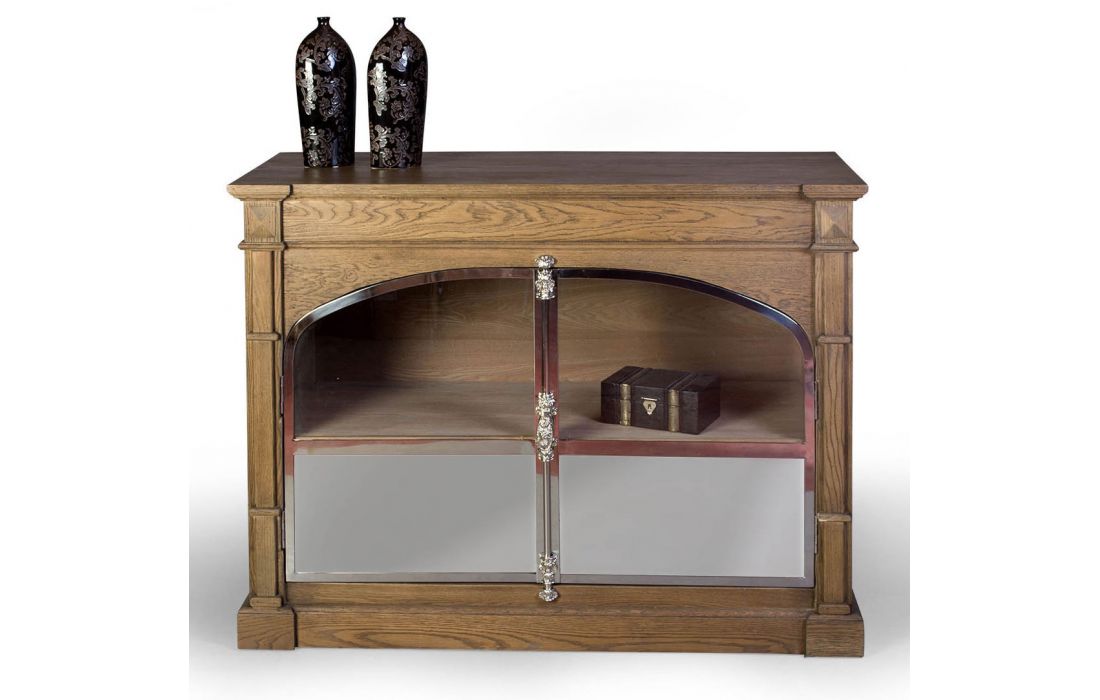 Aparador clássico com estrutura em madeira de carvalho, pormenor das portas em metal e vidro.