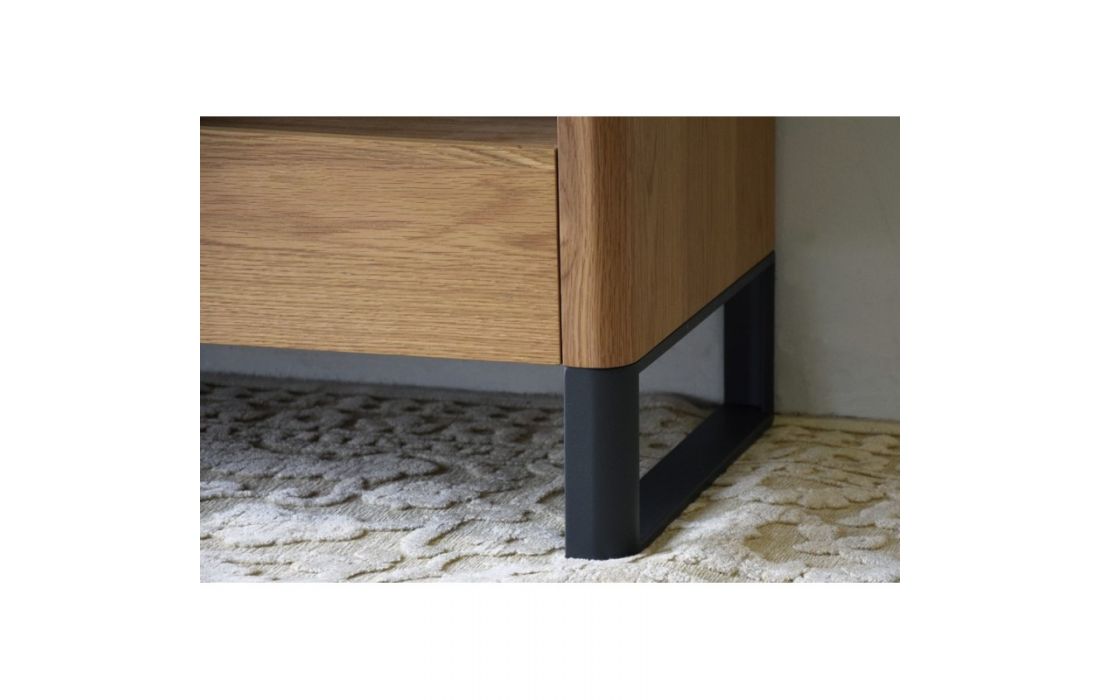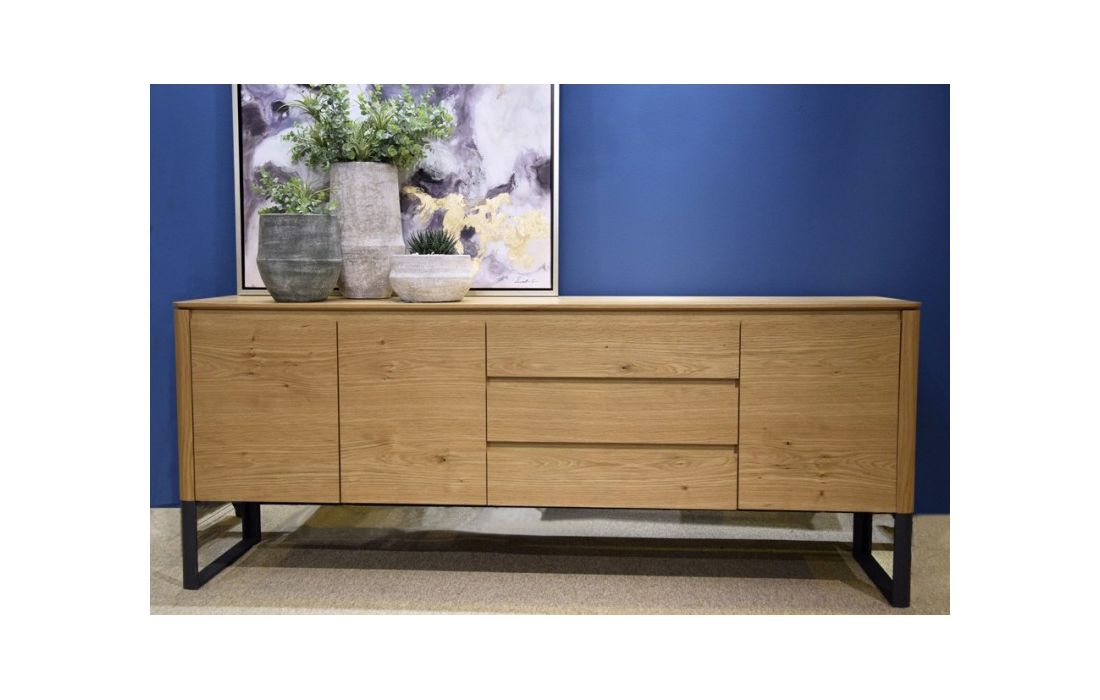 Aparador com 3 portas e 3 gavetas em mdf folheado a carvalho natural, estrutura em aço pintado de cor grafite mate.